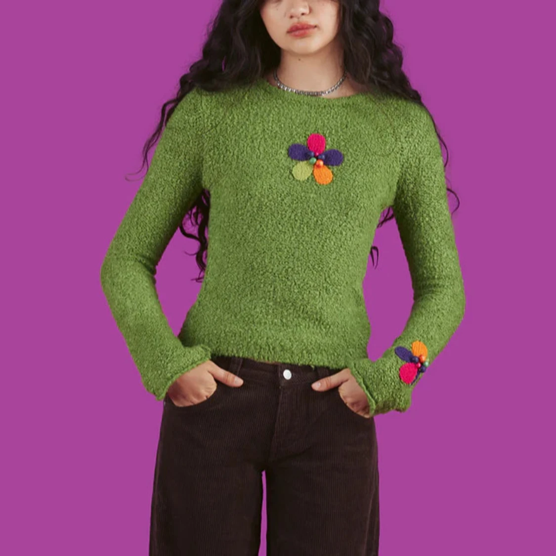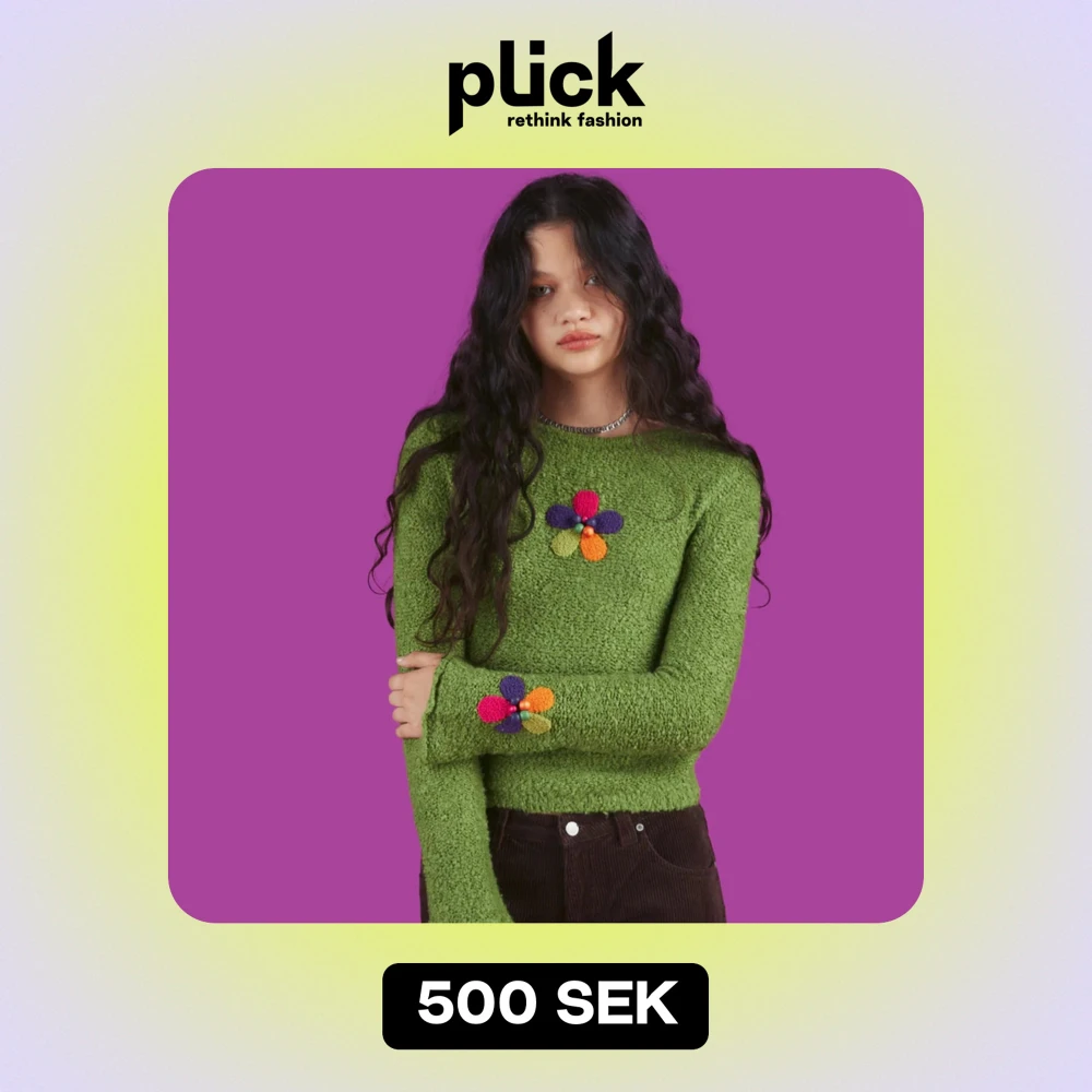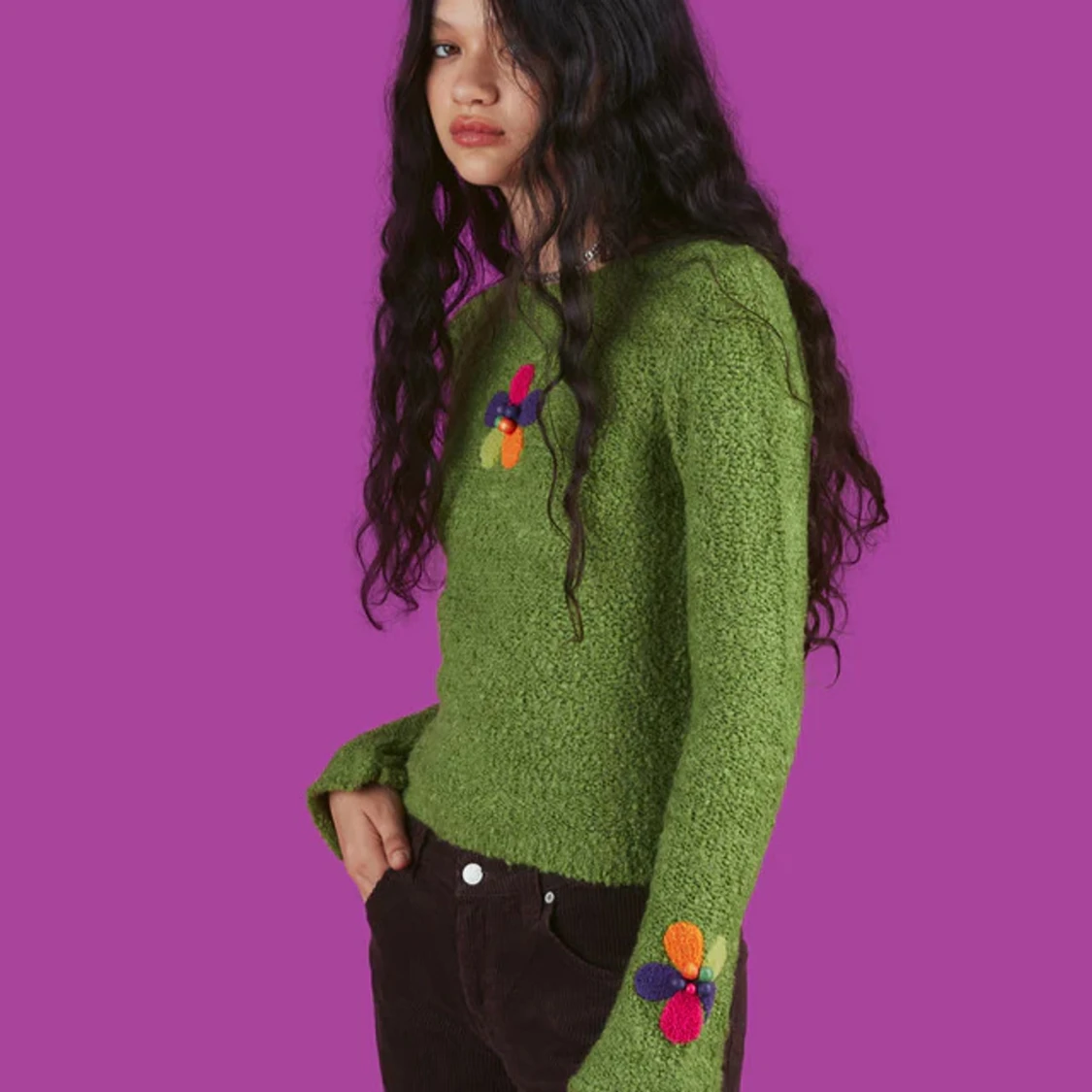 Superfin grön stickad tröja med färgglada blommor på bröstet och ärmen. Perfekt för att liva upp garderoben! Den är långärmad och har en mysig passform. Passar perfekt till höst och vår. Från Unif.