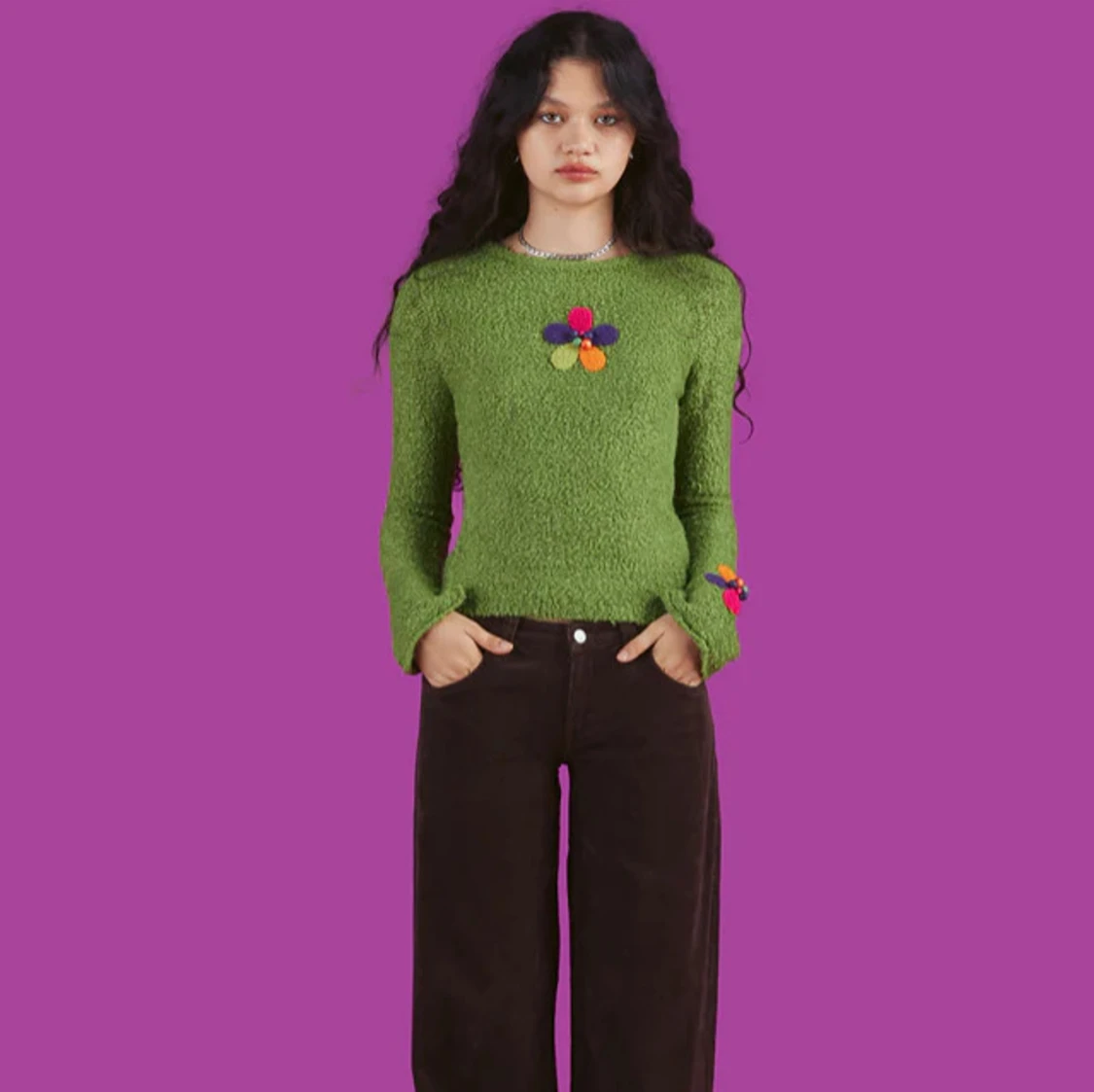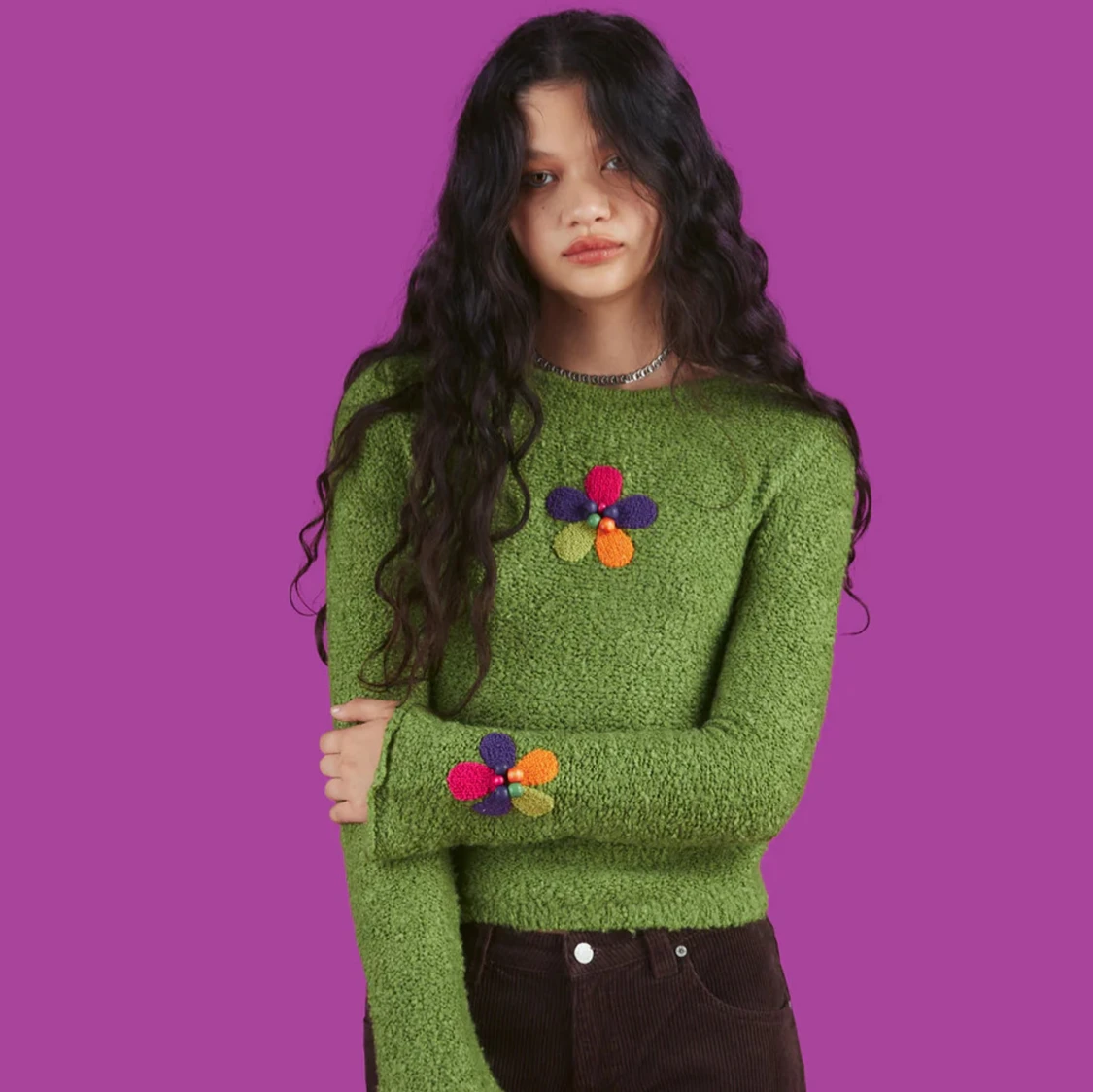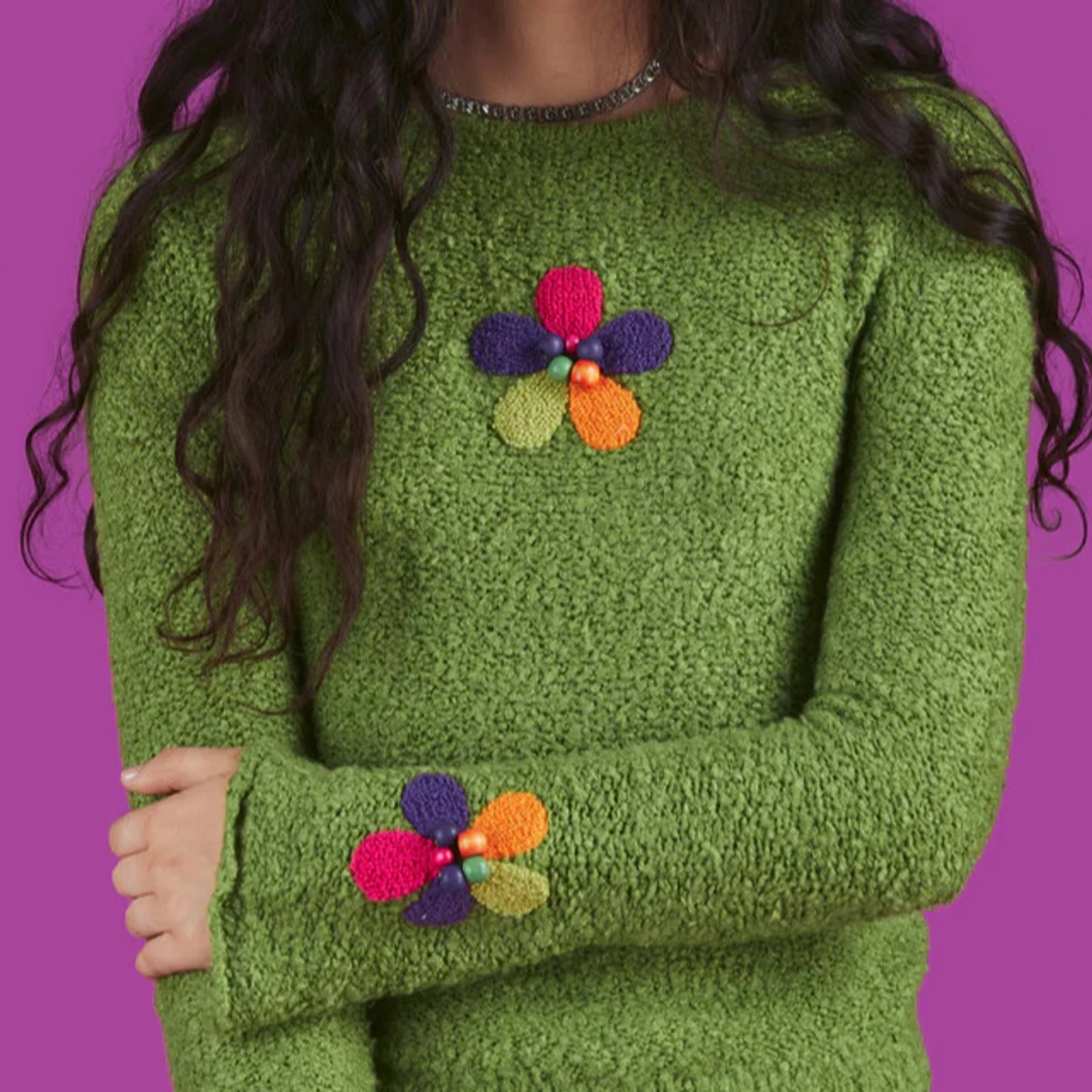 Superfin grön stickad tröja med färgglada blommor på bröstet och ärmen. Perfekt för att liva upp garderoben! Den är långärmad och har en mysig passform. Passar perfekt till höst och vår. Från Unif.
