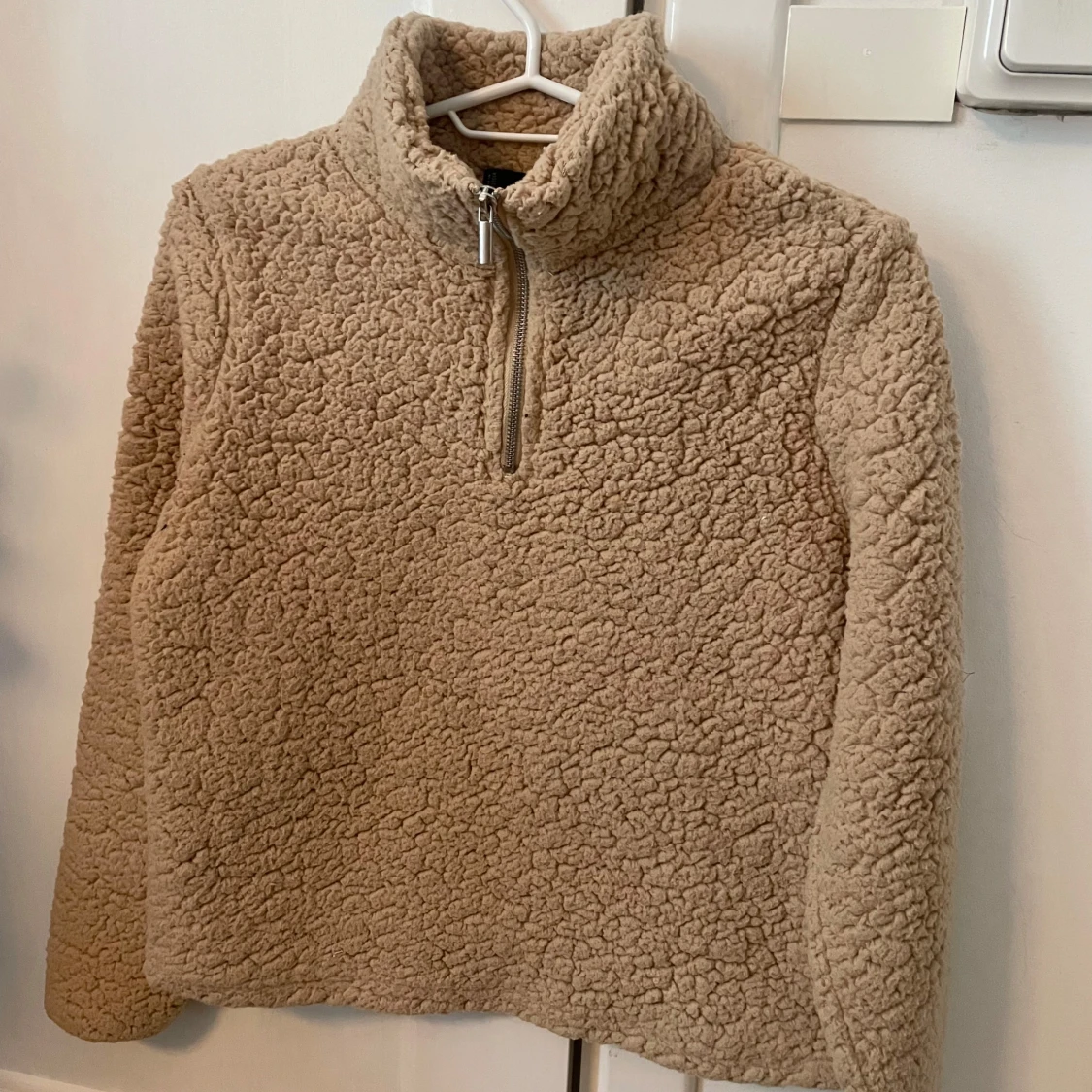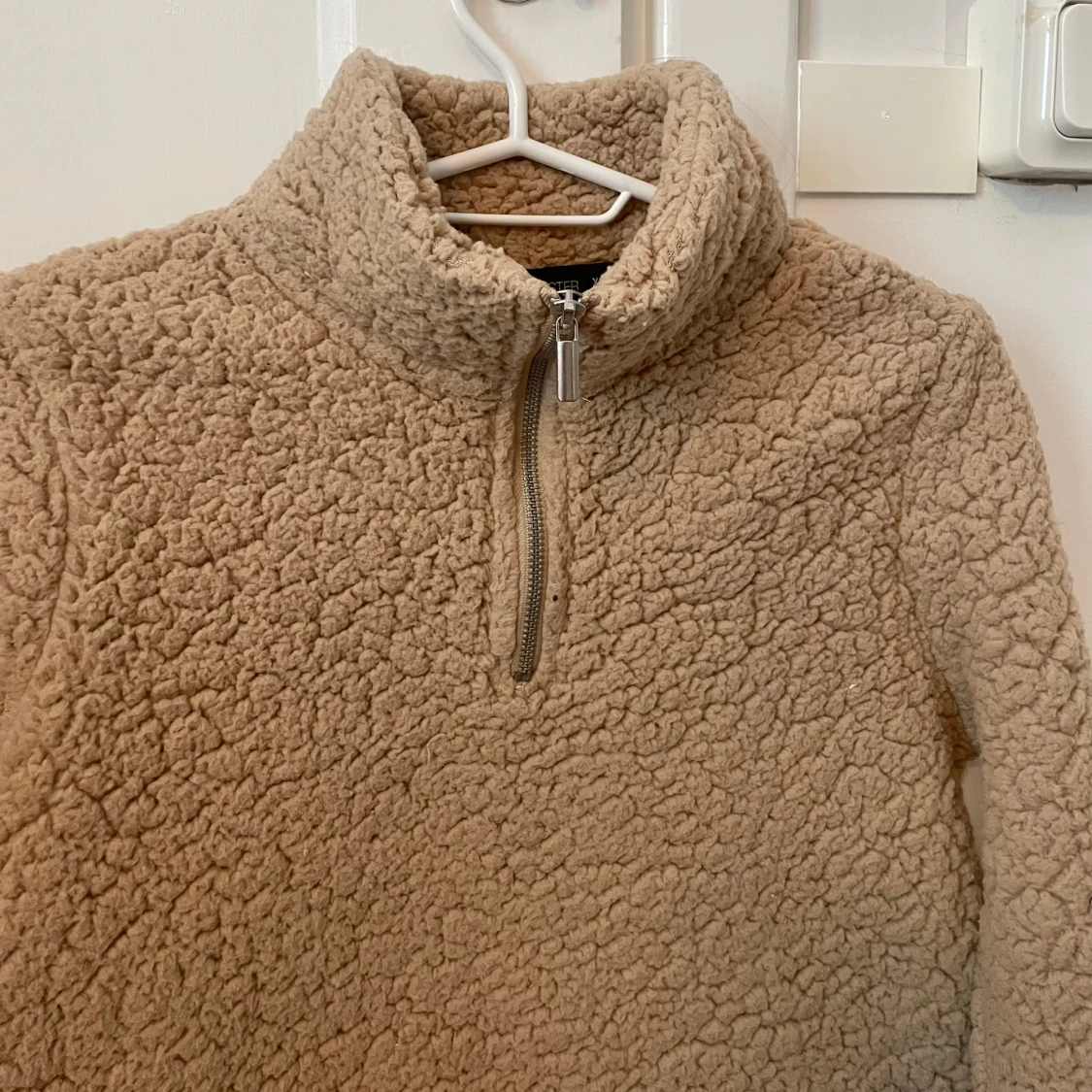 Supermjuk och mysig beige teddy fleece. Tröjan har en hög krage och en praktisk half zip-dragkedja framtill. Perfekt för kyliga dagar och har långärmad passform. Oversized och fluffig look som är riktigt trendig just nu.