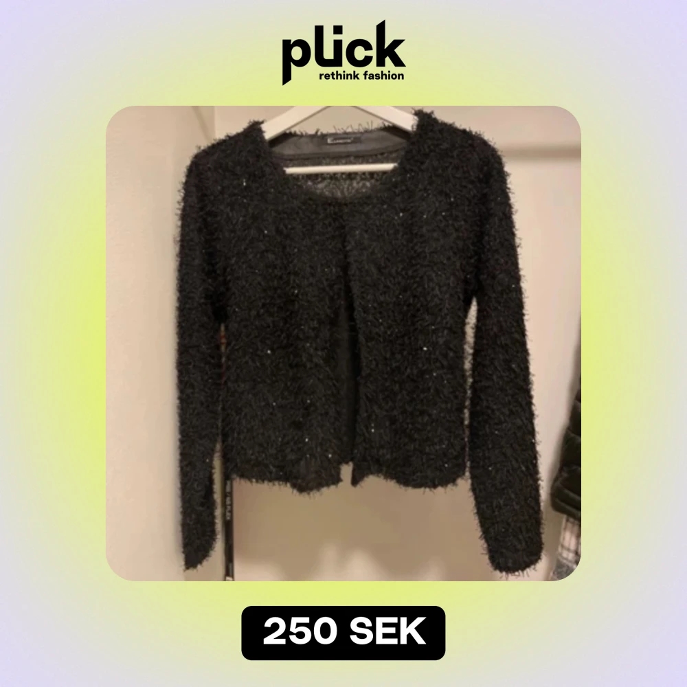 En superfin kofta från Elinette som är svart med små skymtningar av klitter, tyvärr finns ingen lapp med storlek på men tror att den skulle passa en XS - S Bredd- 42 cm. Längd- 47 cm