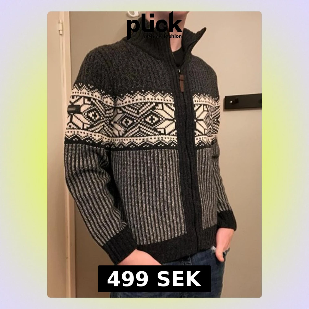Säljer en mörkgrå stickad kofta från märket Pierre cardigan Paris, med dragkedja och hög krage. Koftan har ett snyggt vitt och svart nordiskt mönster över bröstet och ribbade partier på ärmar och nedre delen. Perfekt för kalla dagar och riktigt stilren. Allt gott deluxe garderoben 🤩