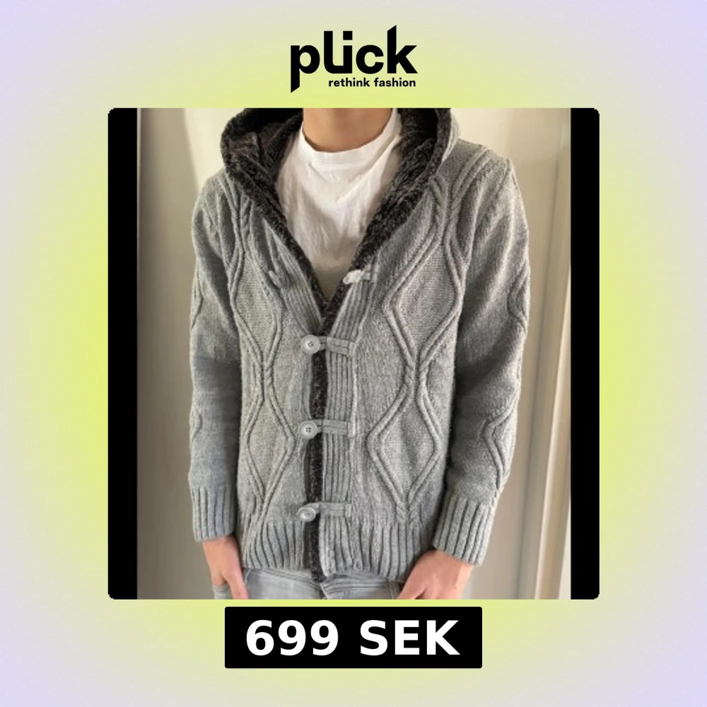 Mysig grå stickad kofta med knappar och en huva fodrad med mjuk päls. Perfekt för kyliga dagar. Den har ett snyggt kabelstickat mönster och ribbade muddar.