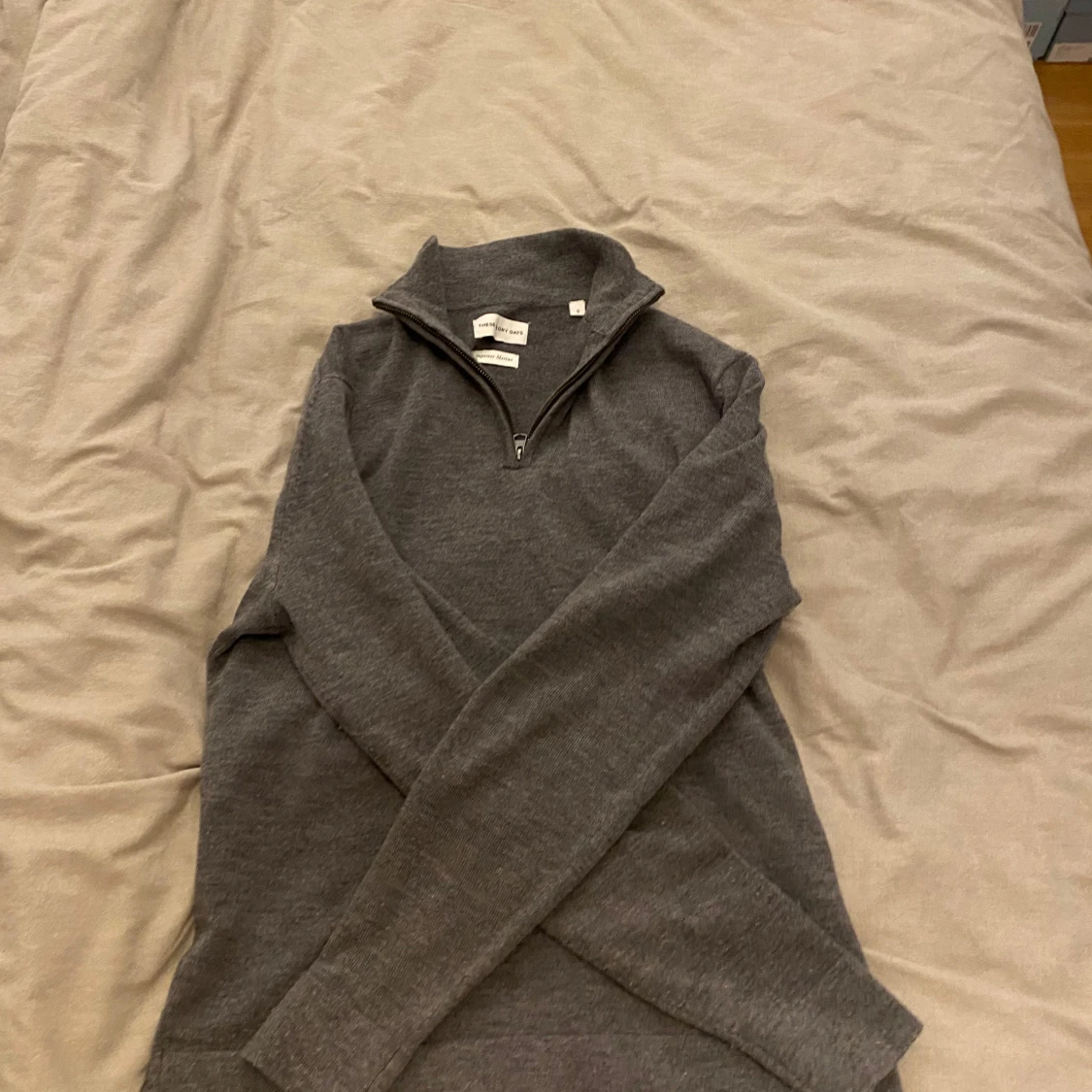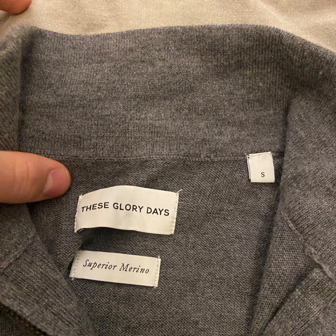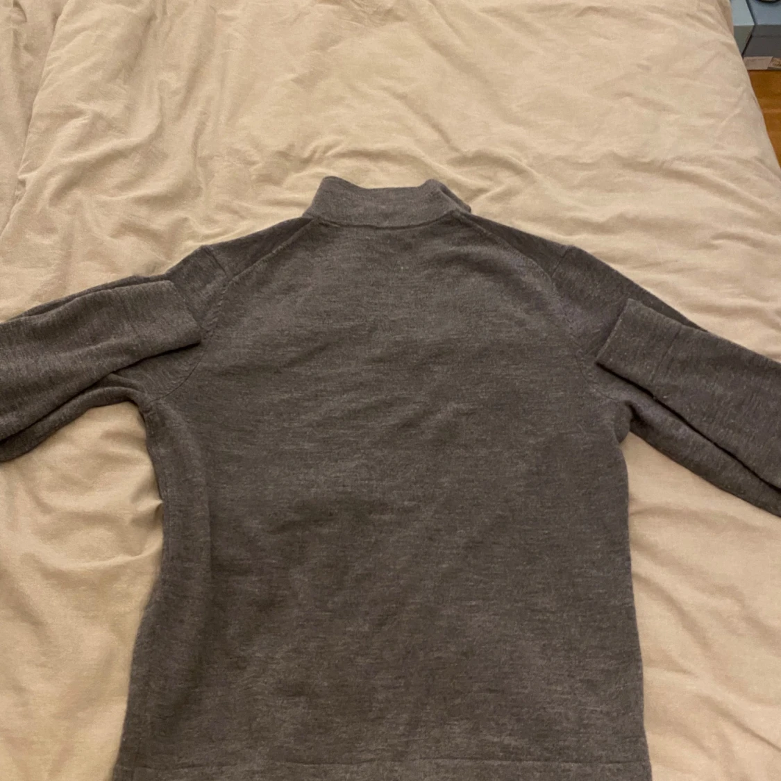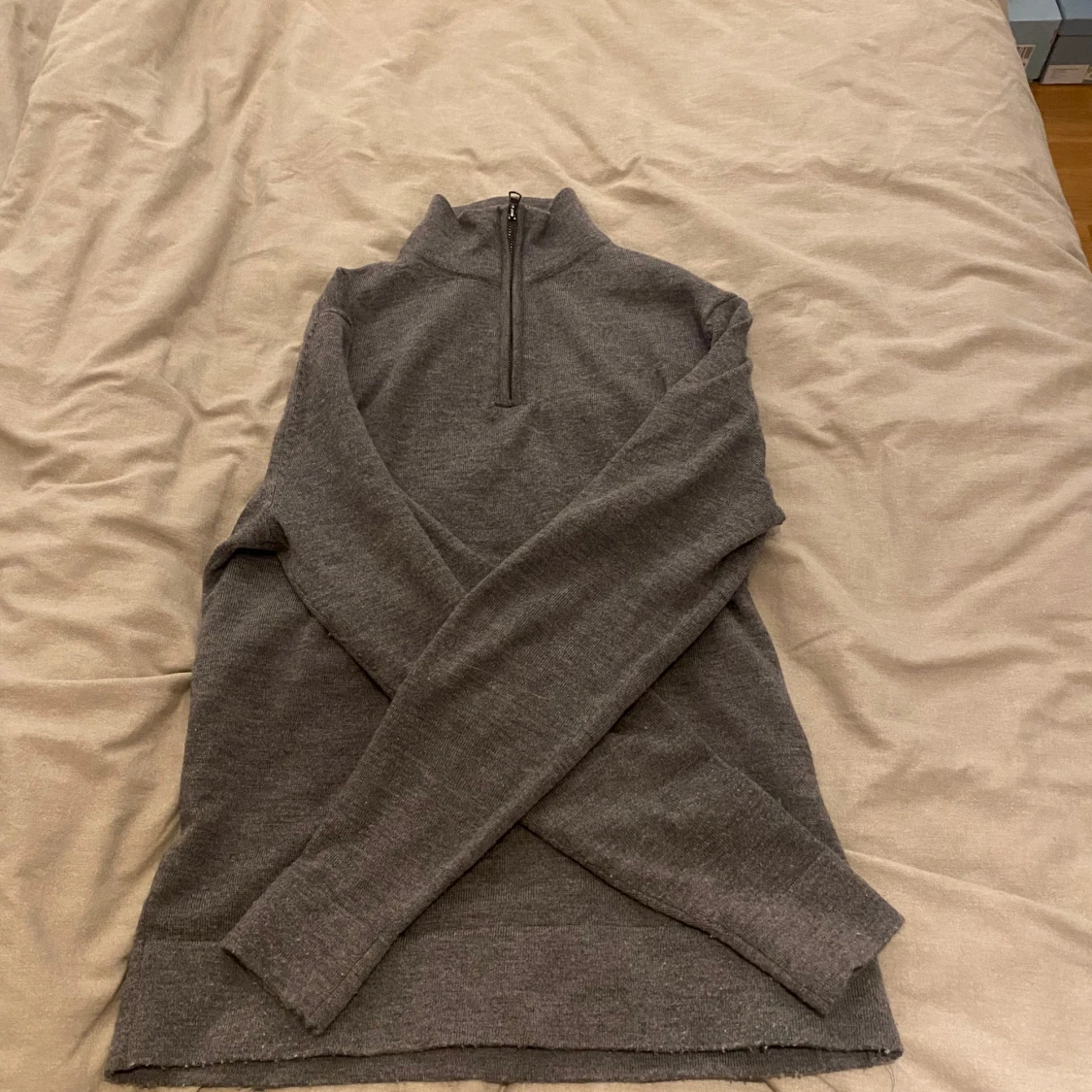 Säljer en stilren grå tröja i merinoull från These Glory Days. Tröjan har en halv dragkedja och långa ärmar, perfekt för kyligare dagar. Den är mjuk och bekväm med en klassisk design. Bara använd 4 gånger! Ny pris 1100!