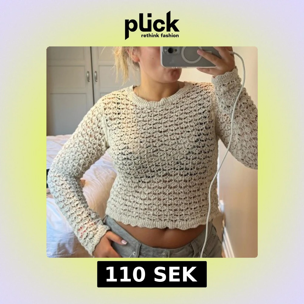 Säljer en beige stickad tröja från Forever 21 i storlek M. Tröjan har ett luftigt, virkat mönster och är croppad med långärmade ärmar och rund hals. Perfekt att styla med jeans eller kjol för en chill look.