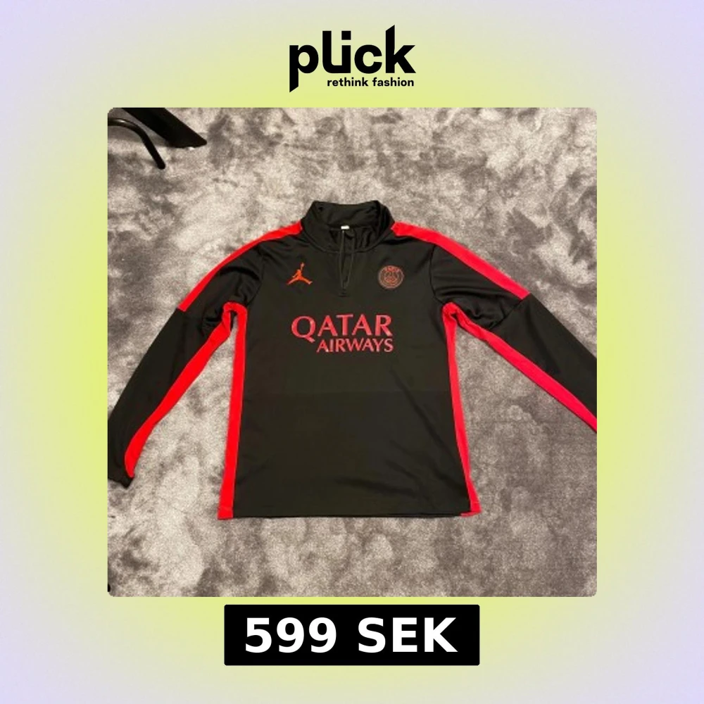 Svart och röd långärmad PSG träningströja från Jordan med halv dragkedja, klubbmärke och Qatar Airways-tryck på bröstet. Tillverkad i funktionsmaterial som andas, med röda detaljer längs ärmar och sidor. Perfekt för fotbollsträning eller supporterliv.