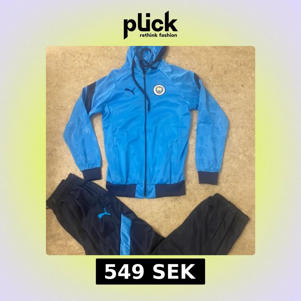 Blå hoodie från Puma med Manchester City-logga på bröstet och svarta detaljer. Tröjan har huva med snörning, hel dragkedja och ribbade muddar. Ärmarna har diskret mönster med klubbens emblem. Perfekt för dig som gillar fotboll och sportig stil.