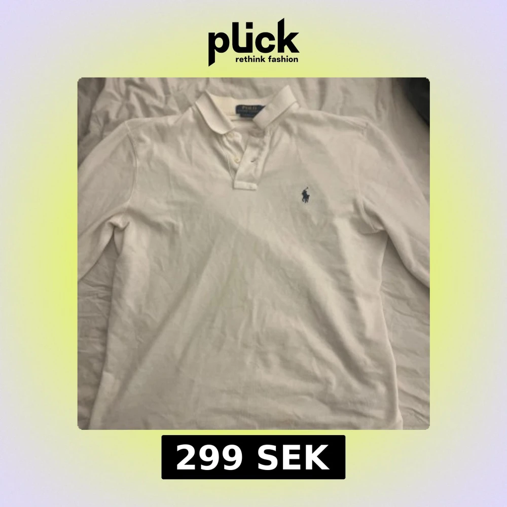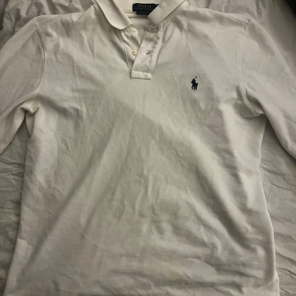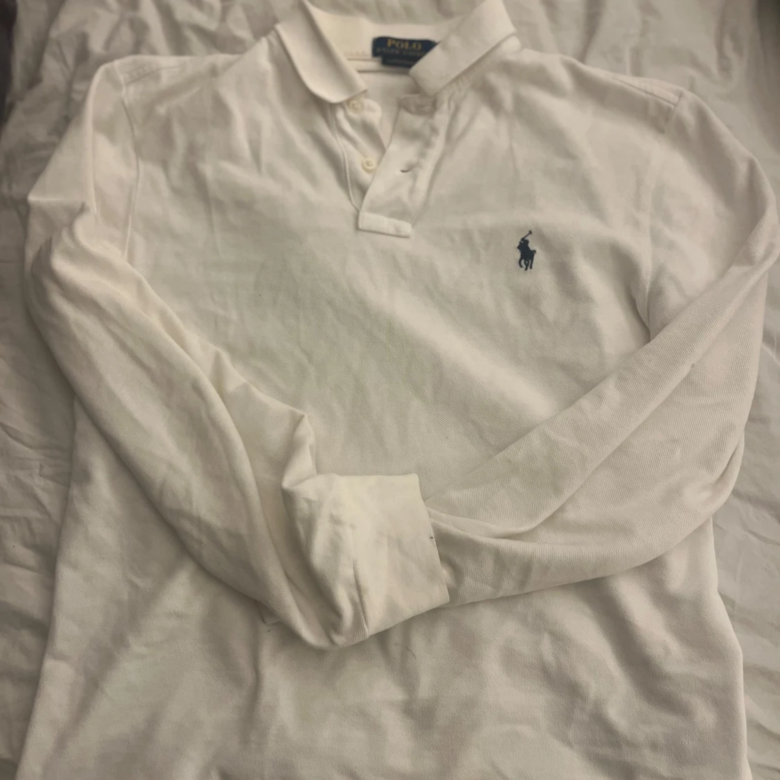 Säljer en klassisk vit pikétröja från Polo Ralph Lauren med den ikoniska loggan broderad i blått på bröstet. Tröjan har långa ärmar och en stilren krage med knappar. Perfekt för en avslappnad men ändå stilren look.