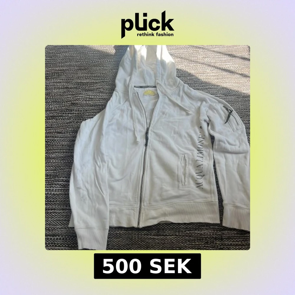 Vit hoodie från Acqua Limone med dragkedja framtill, huva och ribbade muddar. Stor logga med gul citron på ryggen och tryck på ena ärmen. Tillverkad i 100% bomull och har en ficka med dragkedja på ärmen. Perfekt för chill dagar. Finns lite fläckar här o där men skulle gissa på att det går bort i tvätten då den har luggit i men garderob ett tag. storlek M passar upp till 190cm. köpt för 1300kr på deras hemsida men har knappt använt.