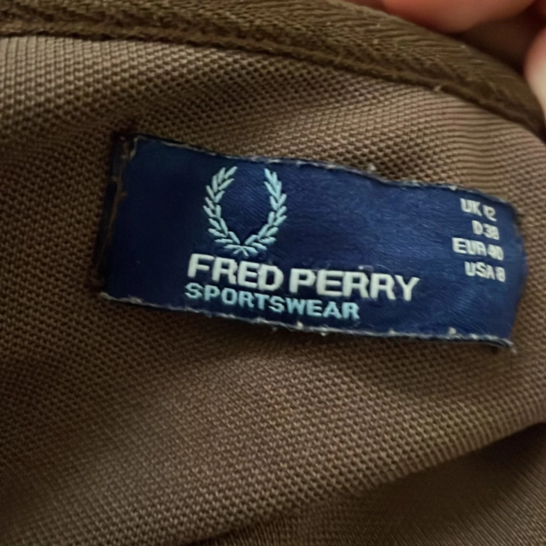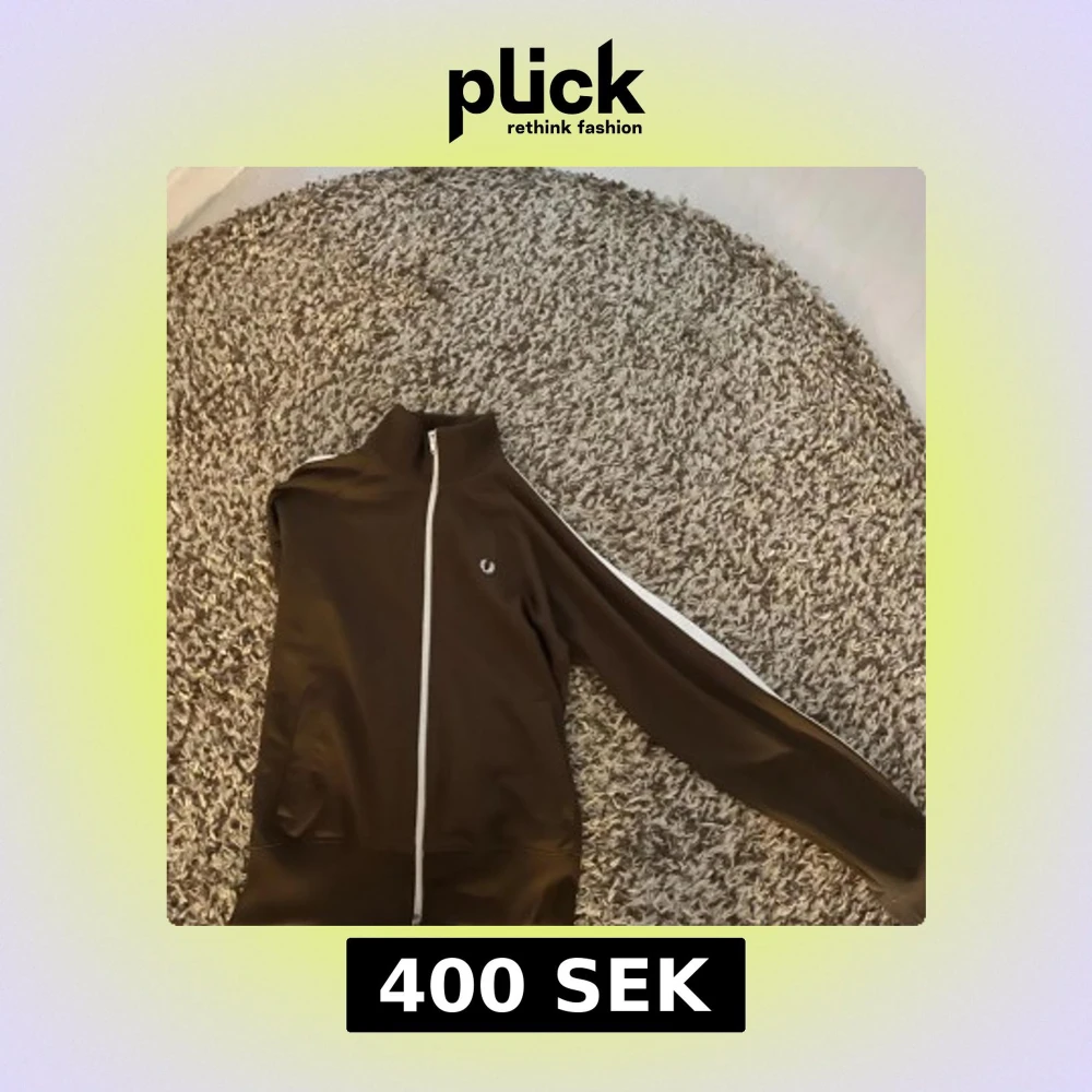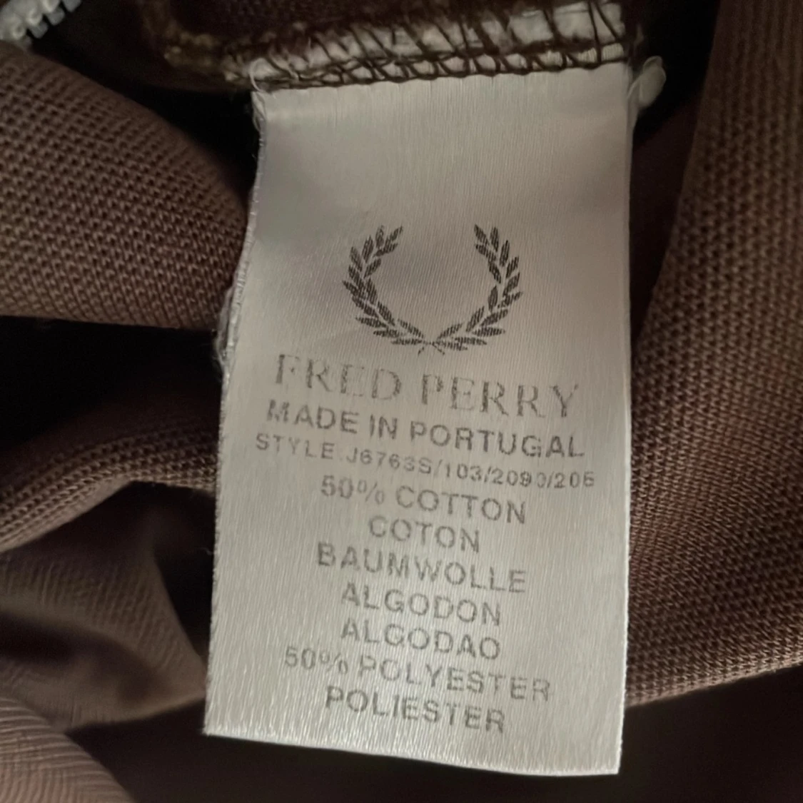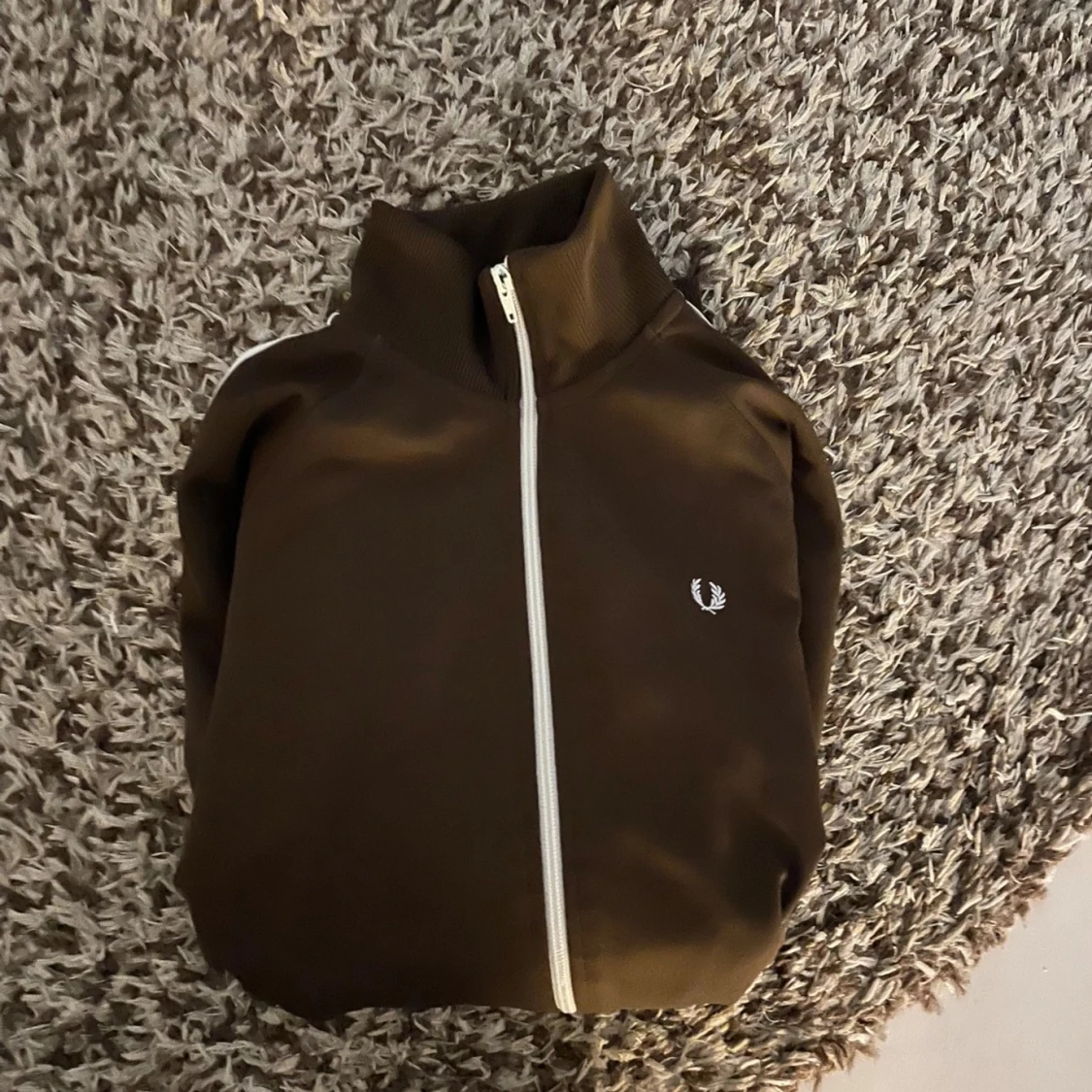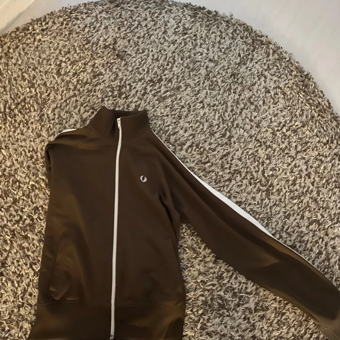 Detta är en brun track jacket med vita detaljer. Den har en dragkedja framtill, vita ränder längs ärmarna och ett litet Fred Perry-märke på bröstet. Designen är stilren och sportig.