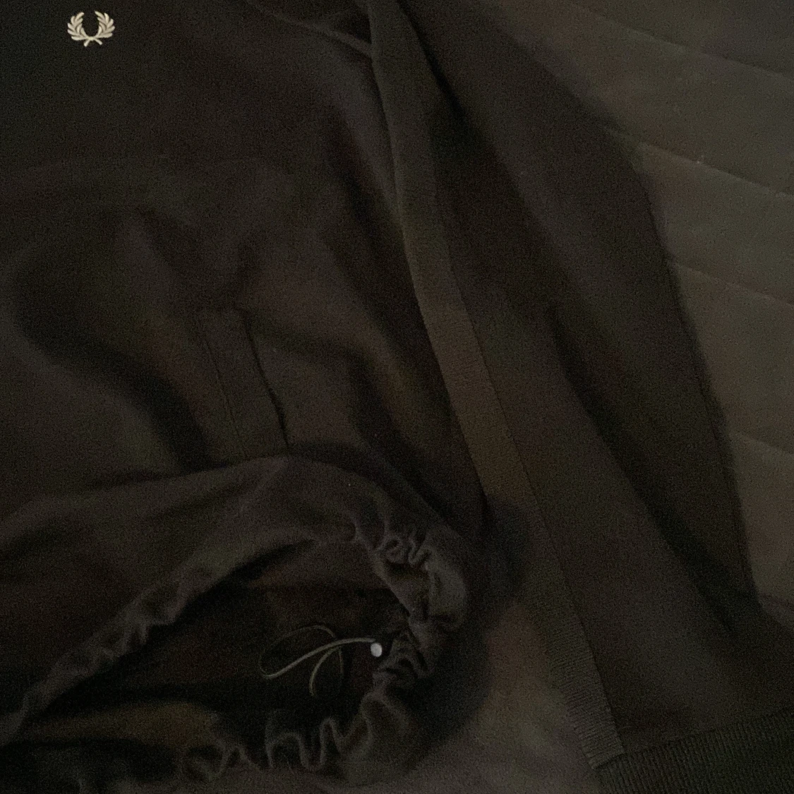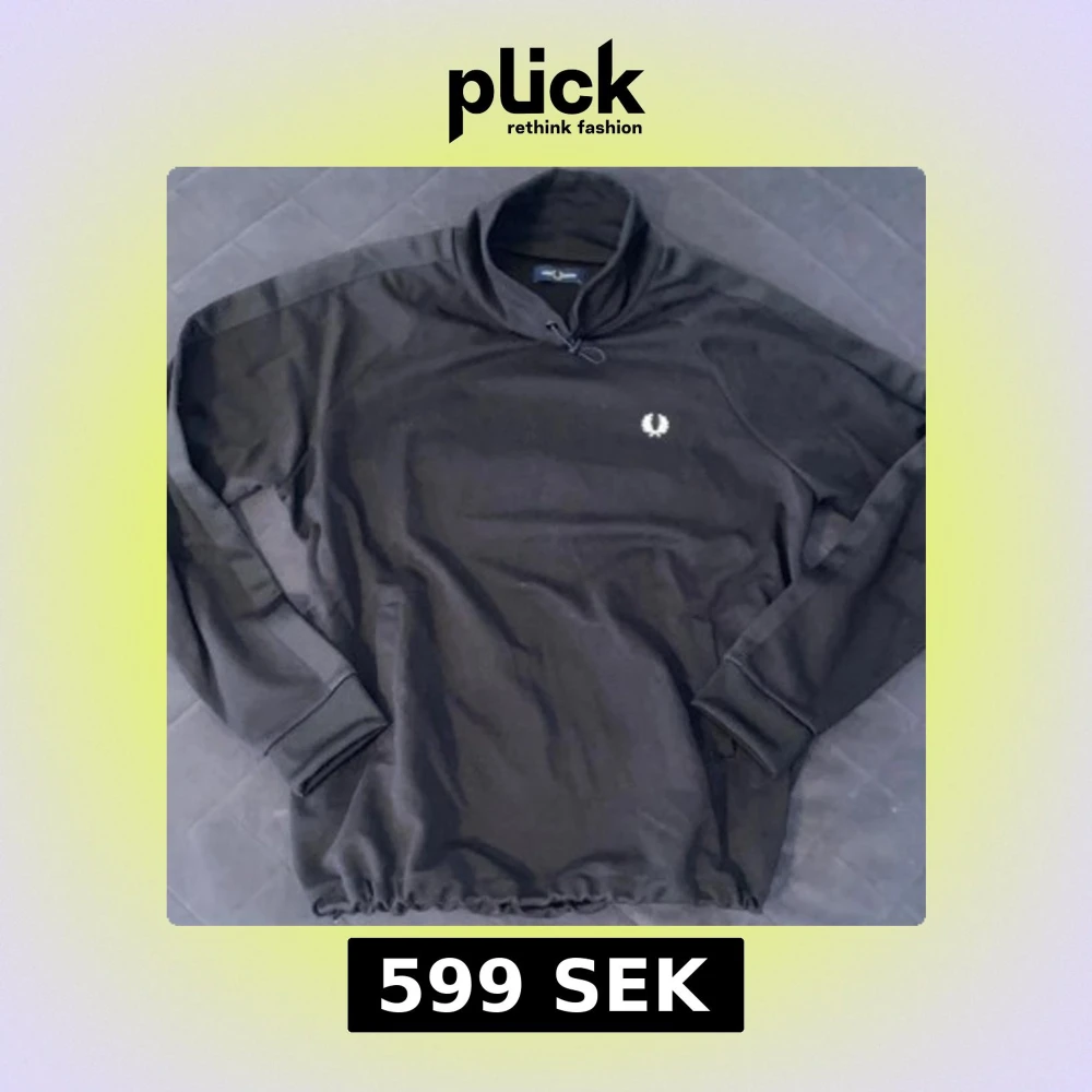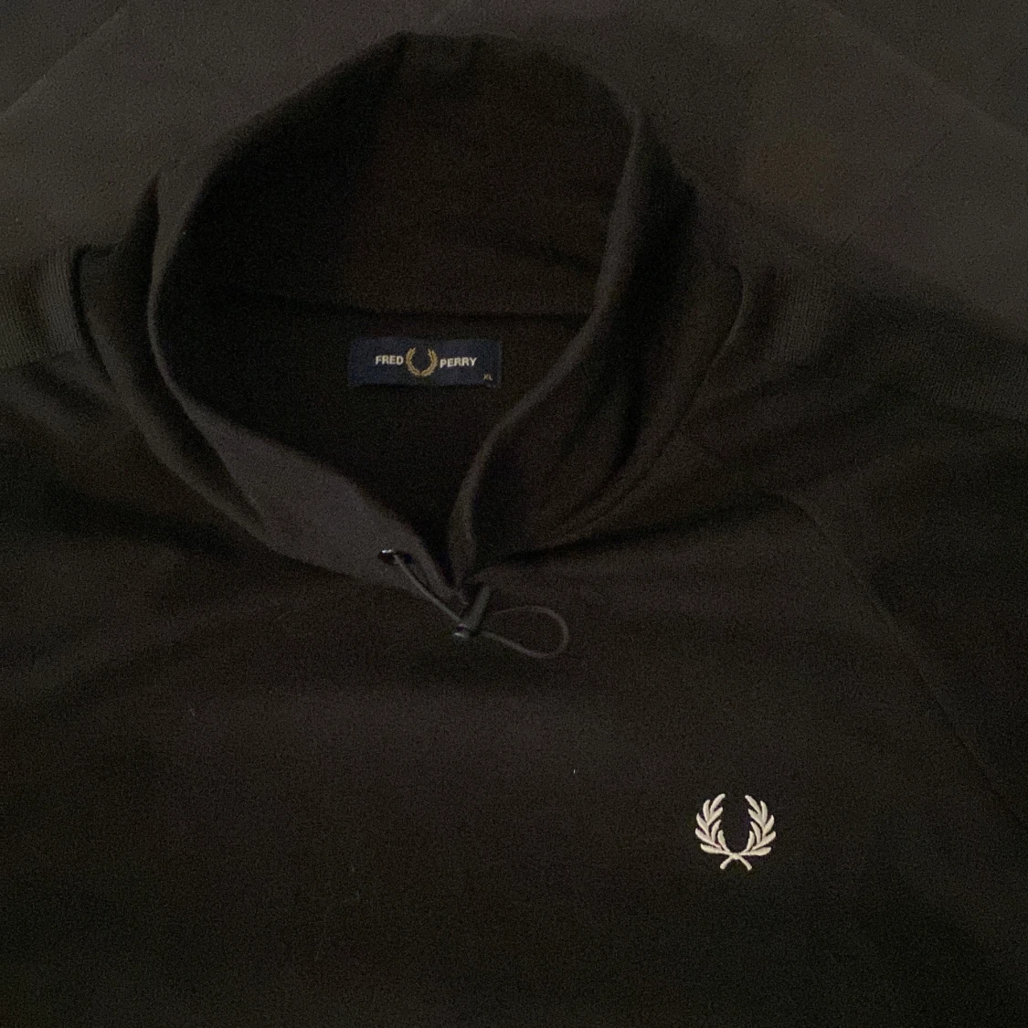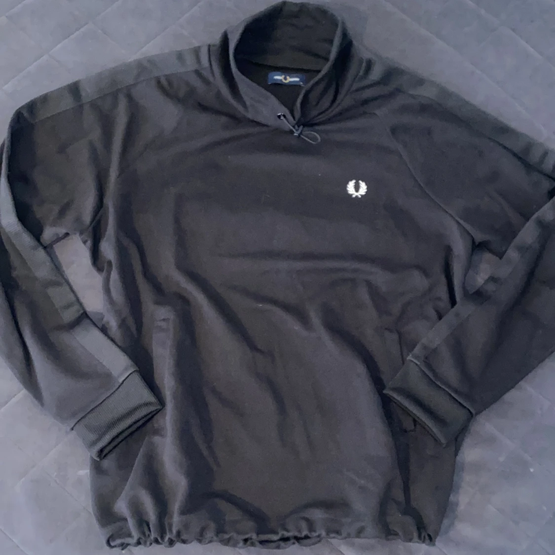 Svart långärmad tröja från Fred Perry med half zip och hög krage. Tröjan har en broderad logga på bröstet och ribbade muddar. Materialet känns mjukt och sportigt. Dragsko nertill för justerbar passform. Storlek XL men passar mer L