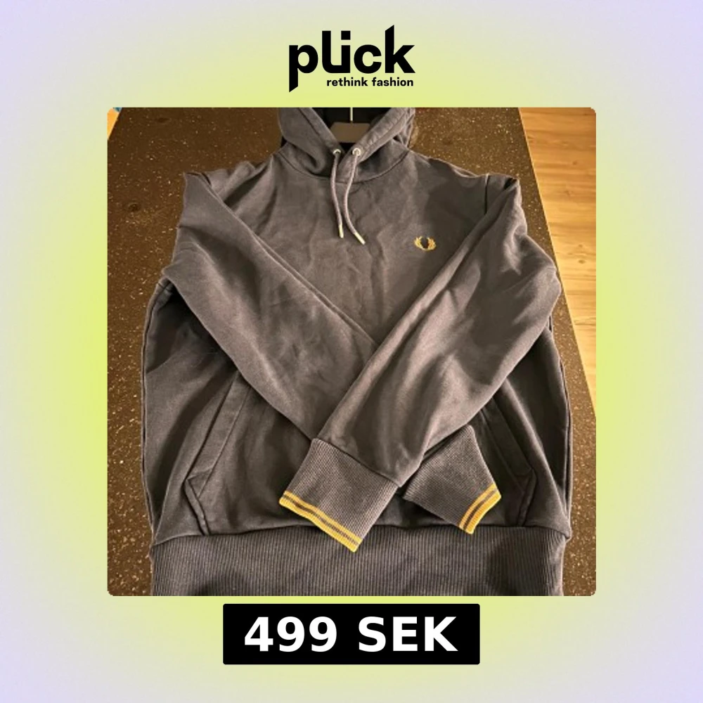 Mörkblå hoodie från Fred Perry med gul broderad logga på bröstet. Tröjan har huva med snörning, ribbade muddar med gul rand och känguruficka framtill. Tillverkad i mjuk bomull, perfekt för chill dagar. Klassisk och stilren design.