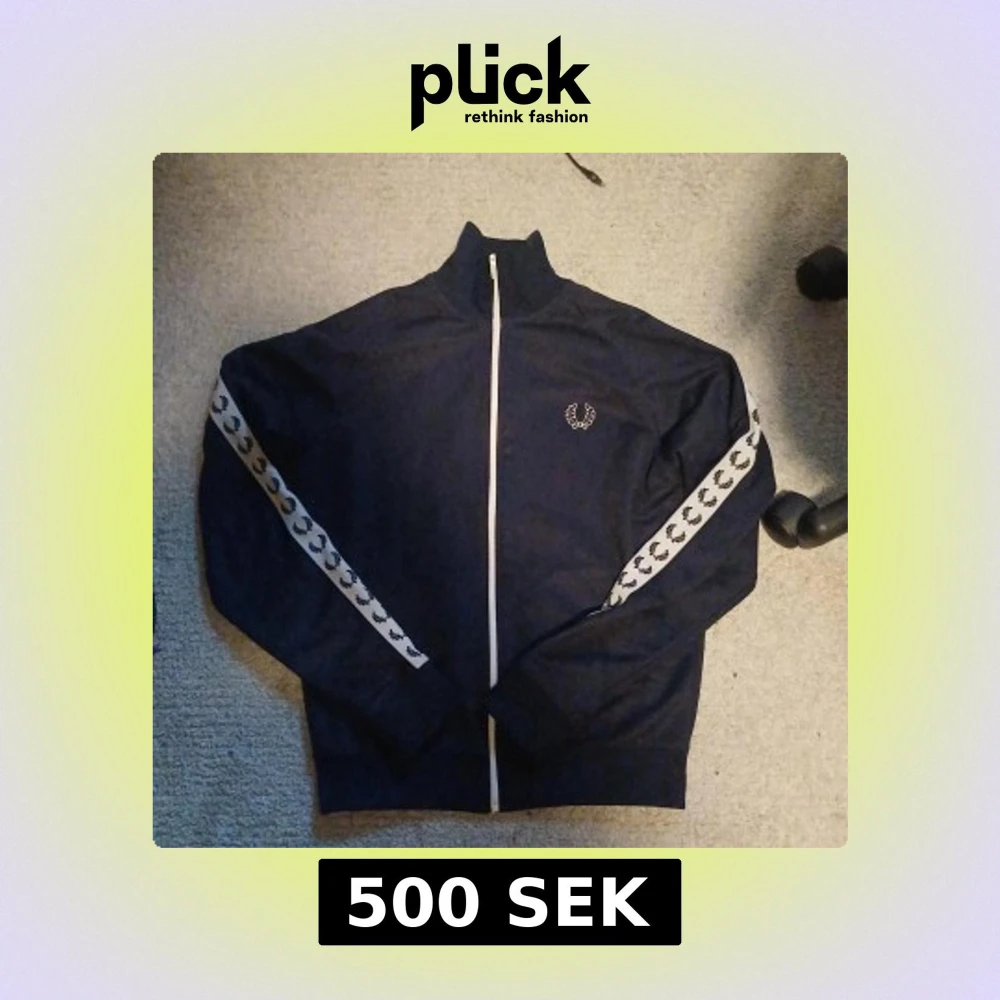 Säljer en marinblå ziptröja från Fred Perry med vita detaljer och logga på bröstet. Tröjan har vita ränder med Fred Perry-loggor längs ärmarna och hög krage. Perfekt för en sportig och stilren look.