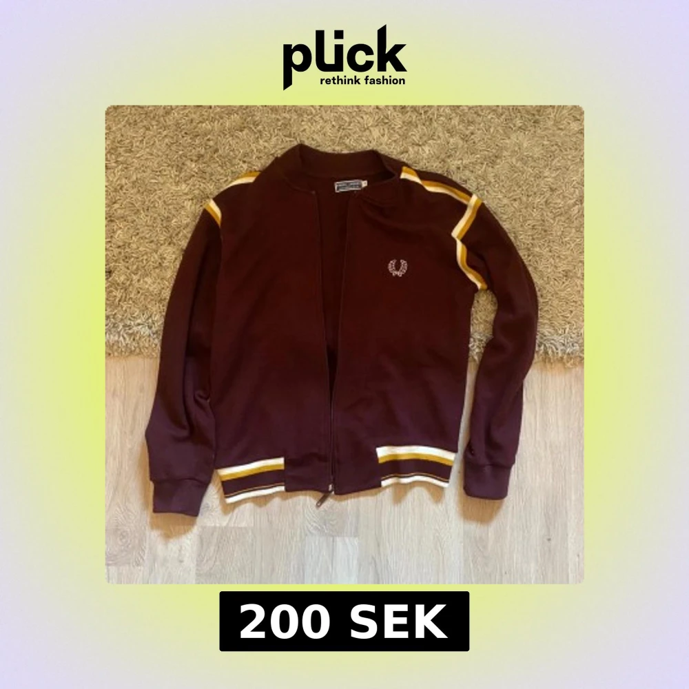 Säljer en vinröd kofta från Fred Perry med dragkedja och vita samt gula ränder på axlar och muddar. Klassisk logga broderad på bröstet. Perfekt för dig som gillar sportig och retro stil.