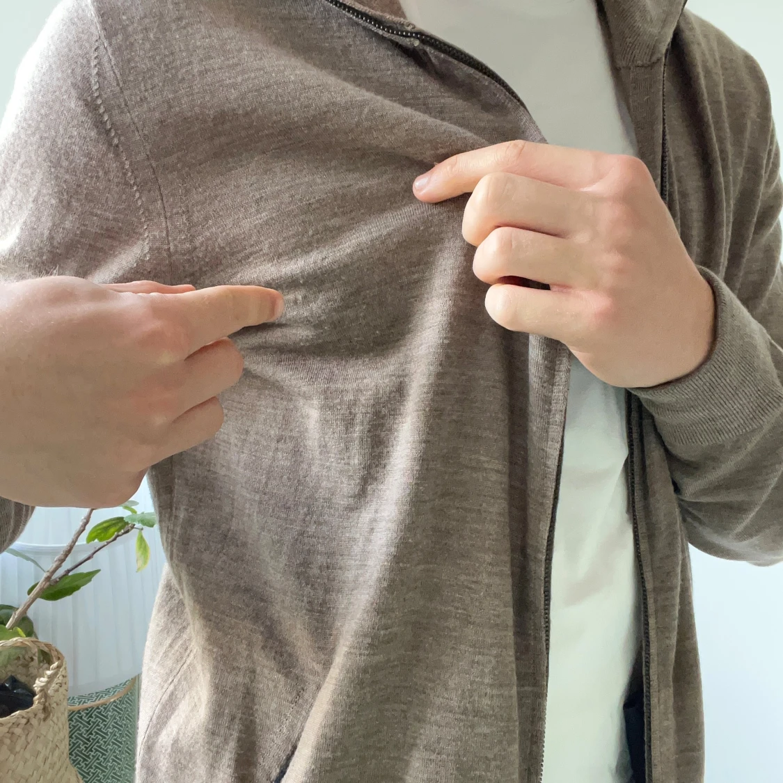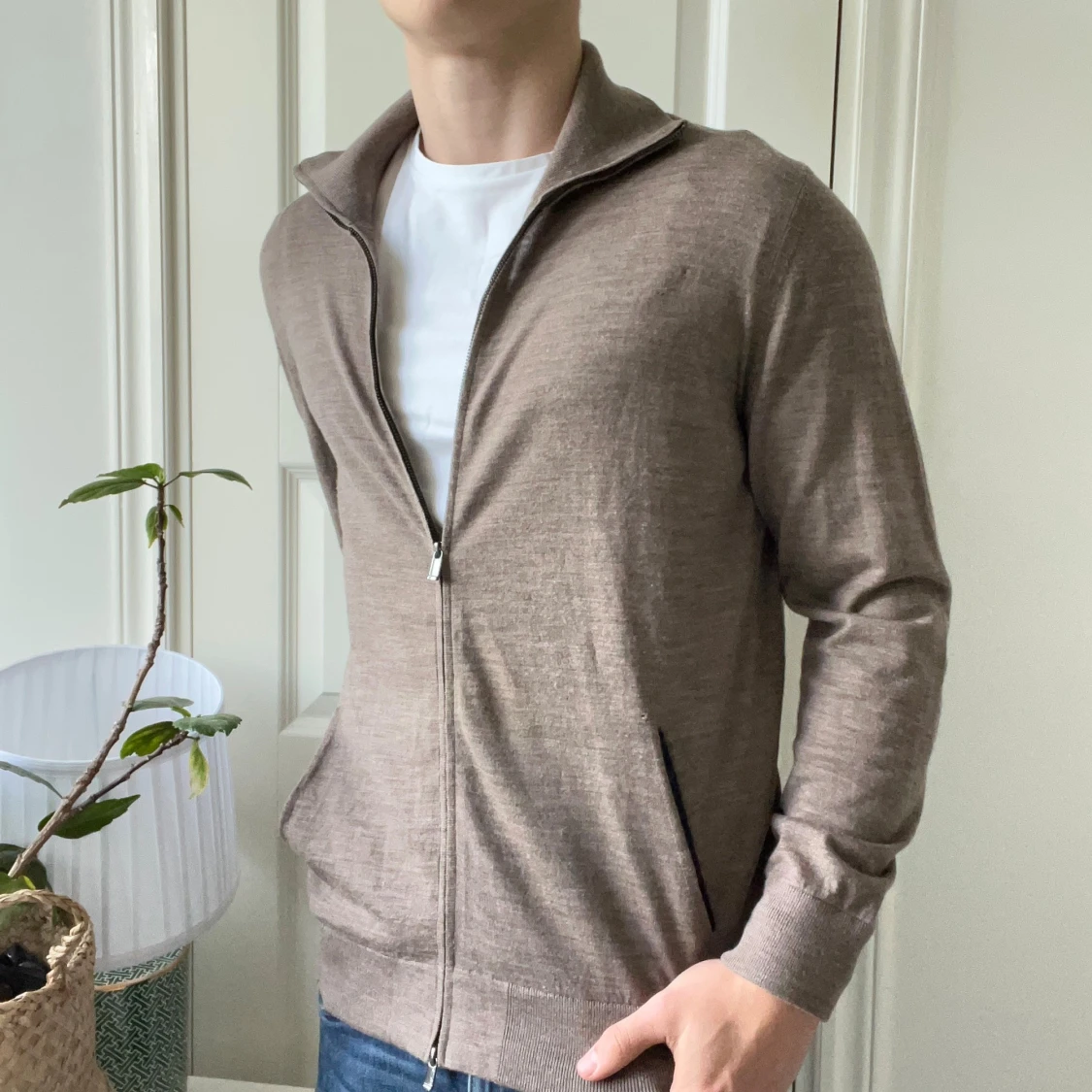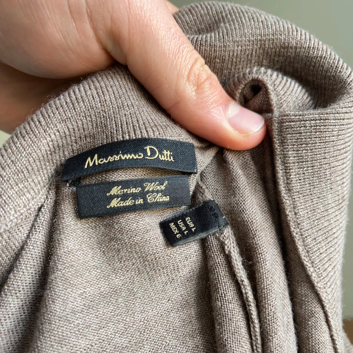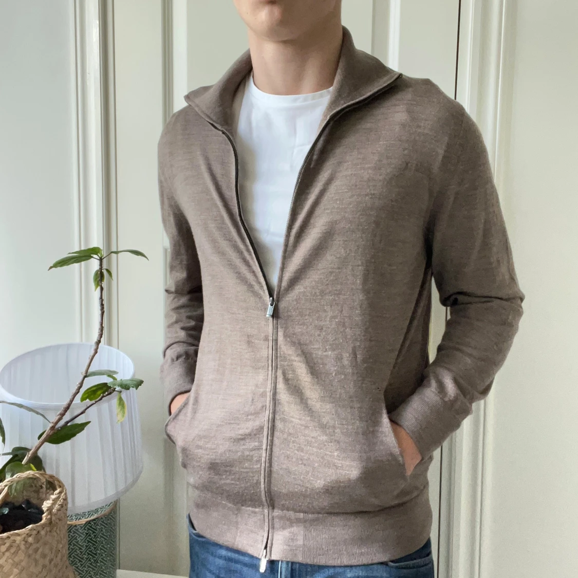 Massimo dutti full zip merino wool, litet hål som ni ser. Merino wool storlek L! Modellen är 180,75kg✌️