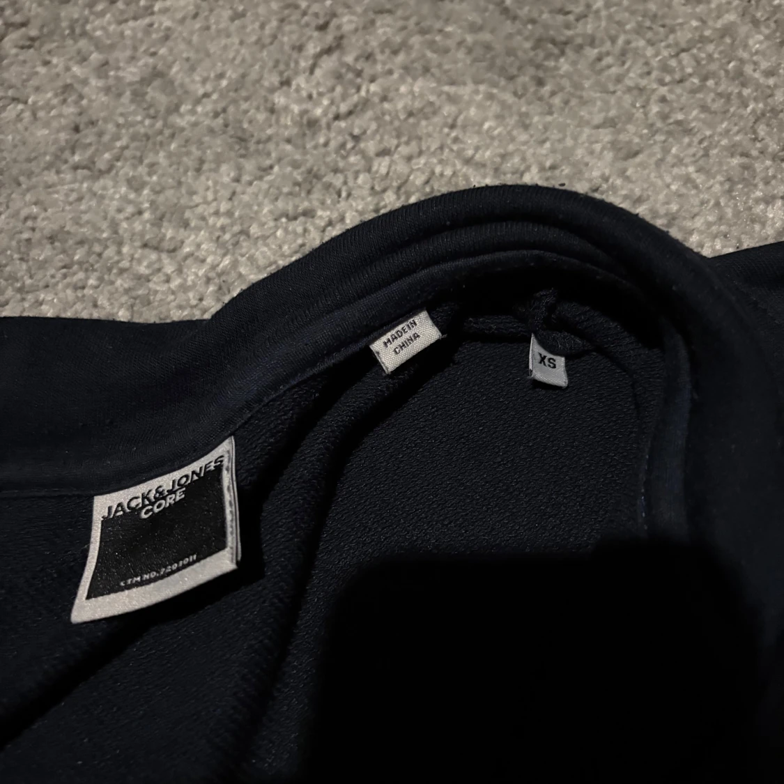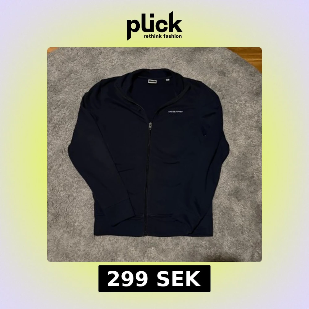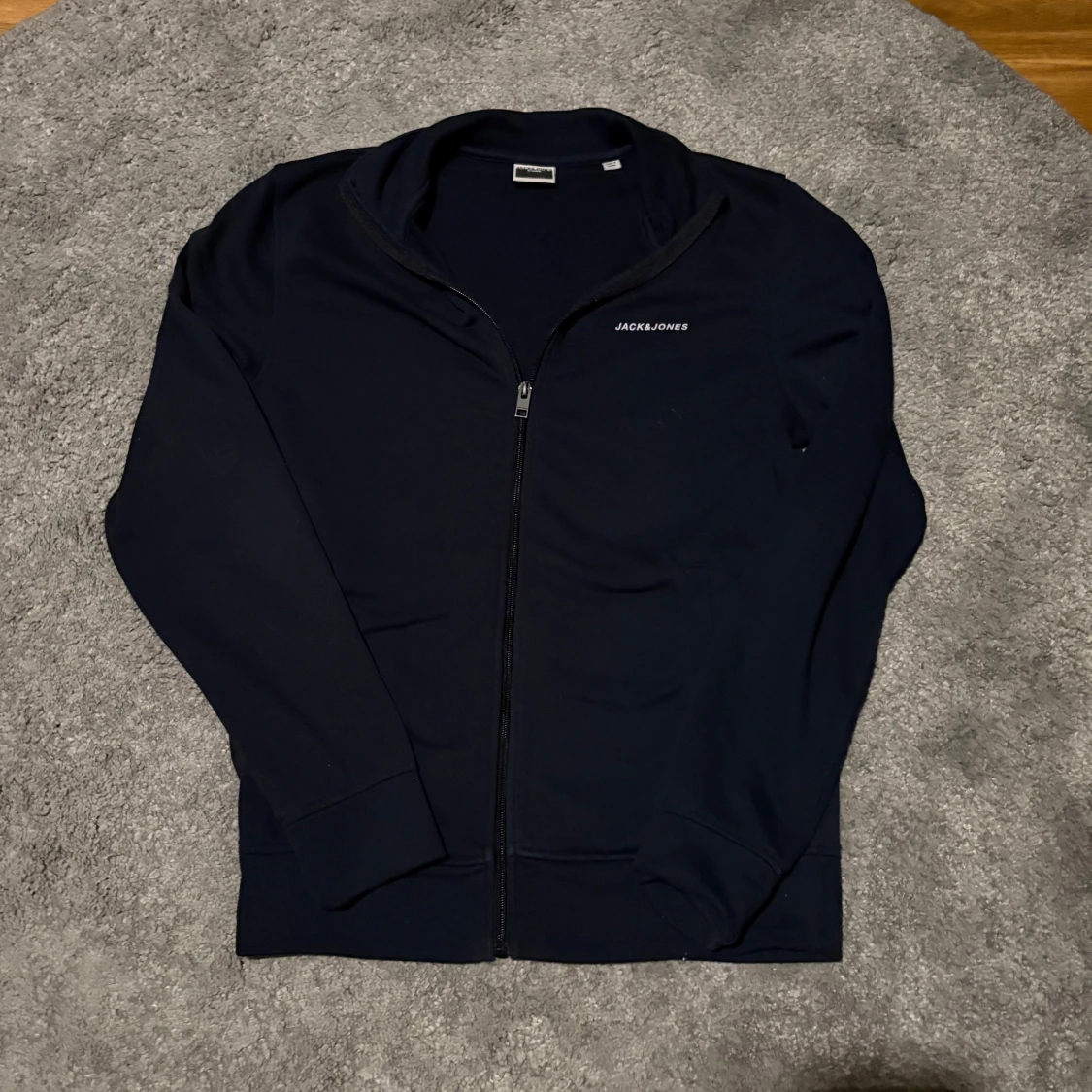Säljer en stilren mörkblå zip från Jack & Jones med dragkedja framtill. Perfekt för en avslappnad look. Den har långa ärmar och en diskret logga på bröstet. Passar bra till både jeans och joggers.