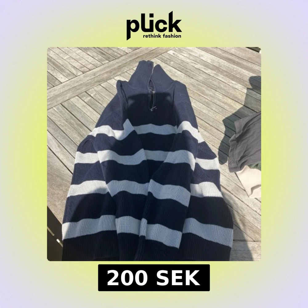 Säljer en stickad tröja från Zara i mörkblått med breda vita ränder. Tröjan har hög krage och dragkedja framtill. Perfekt för kyligare dagar och har en klassisk, sportig look.
