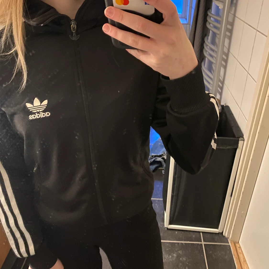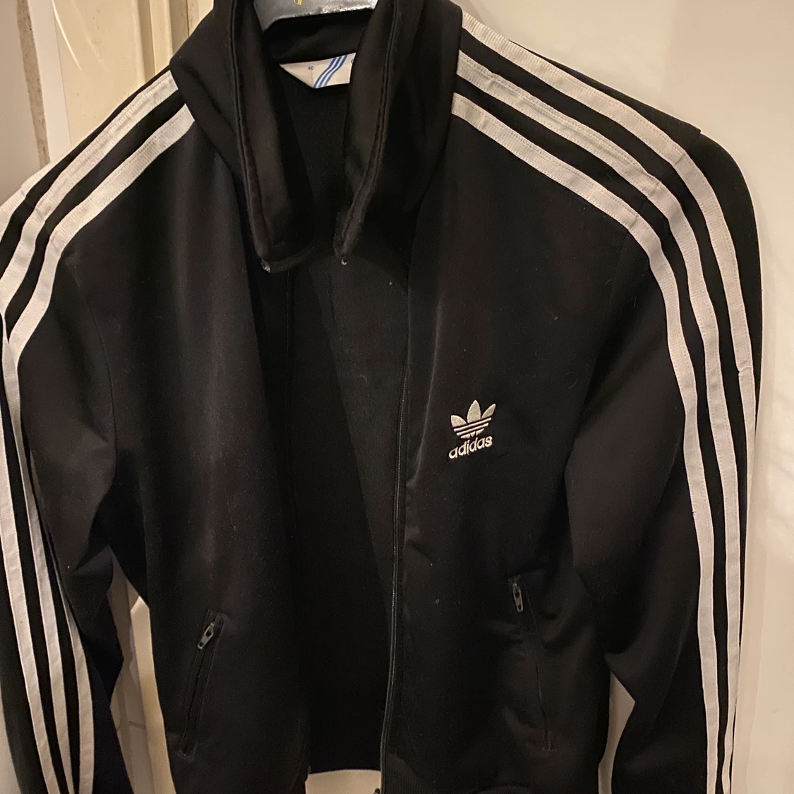 Svart adidaskofta, orginal i storlek 40 men passar även mindre, jag har storlek 34/36 och den passar mig. Den har även ett stort adidasmärke på ryggen