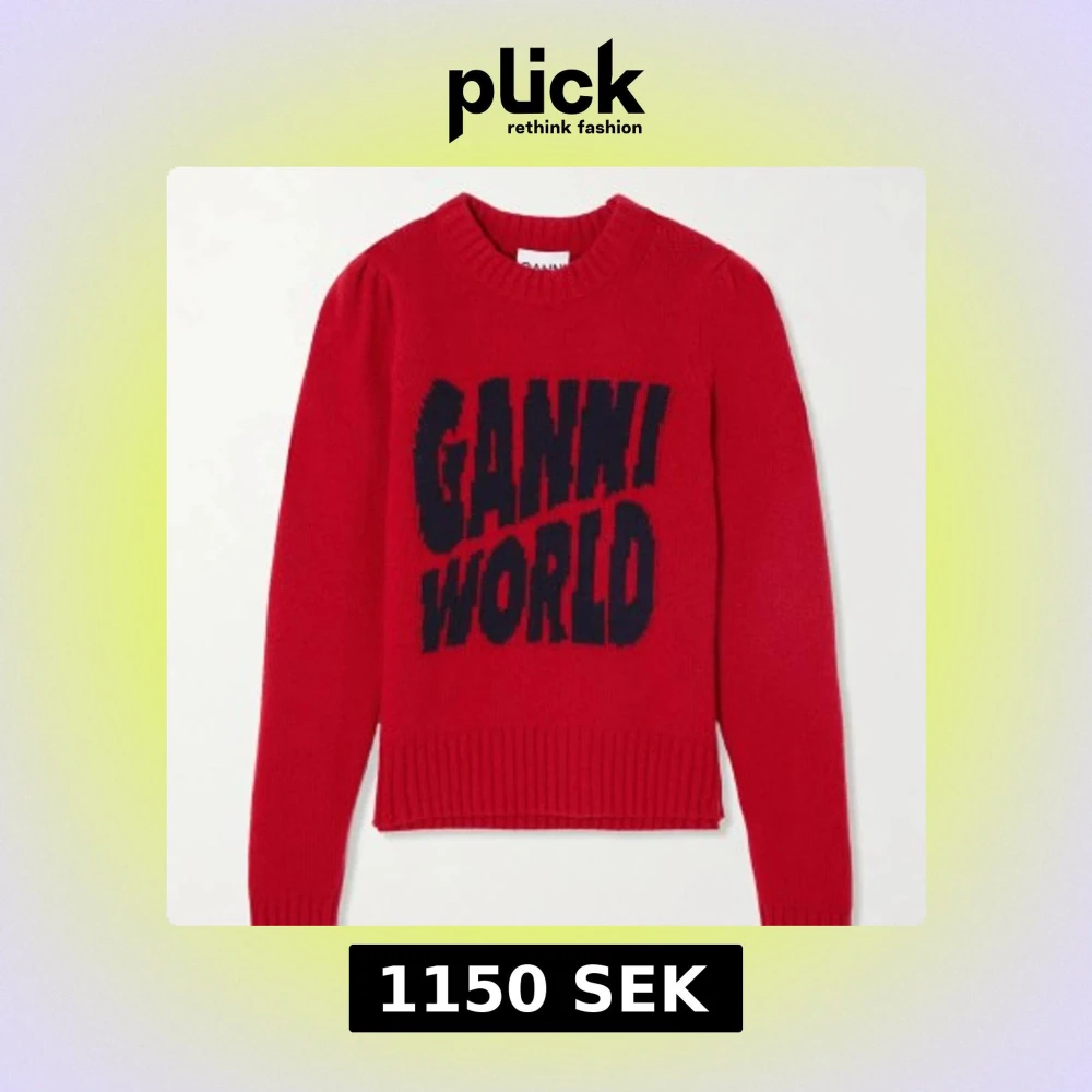 Cool röd stickad tröja från Ganni med marinblå GANNI WORLD-tryck framtill. Storlek M