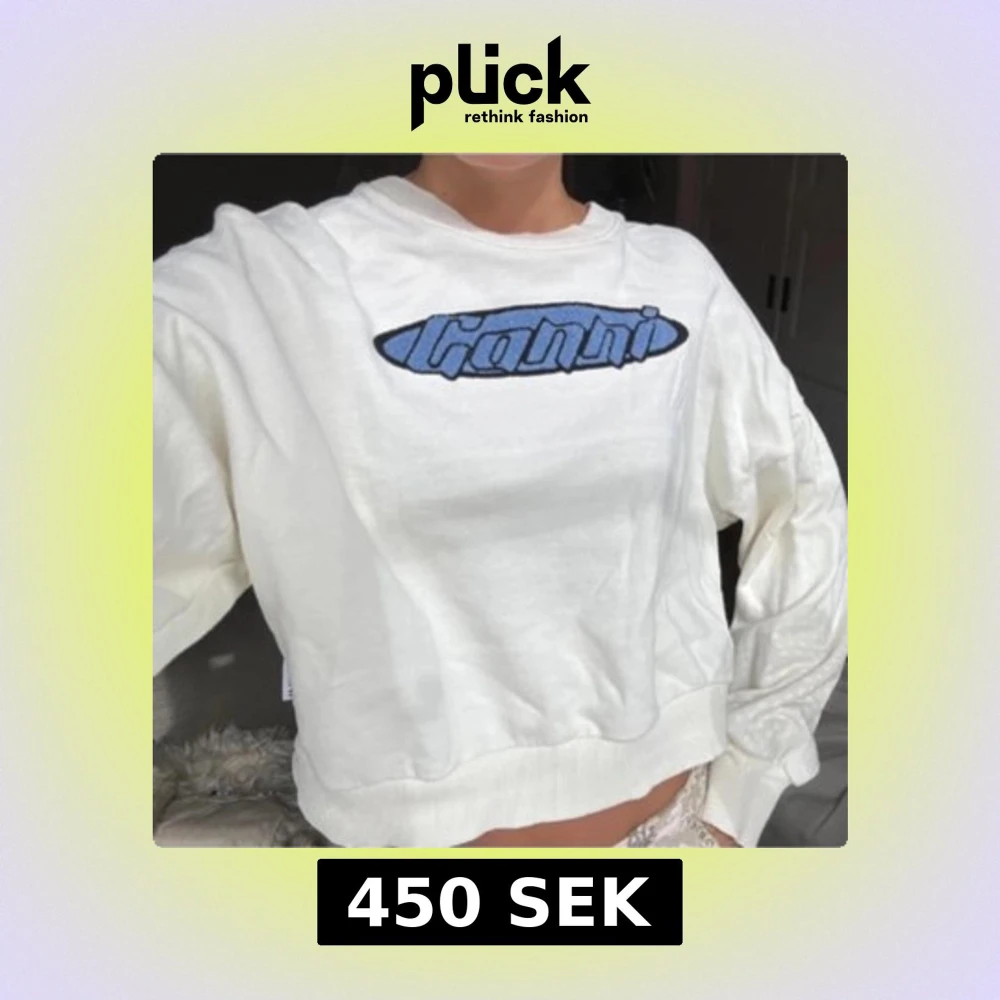 Säljer en vit sweatshirt från Ganni med blått logotryck på bröstet. Tröjan har långa ärmar och en avslappnad passform. Perfekt för en casual look.