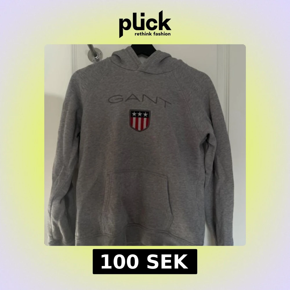 Säljer en grå hoodie från GANT med broderad logga och sköld på bröstet. Tröjan har huva och en stor magficka framtill. Perfekt för en avslappnad stil och enkel att matcha med det mesta. Den passar mig som har storlek S