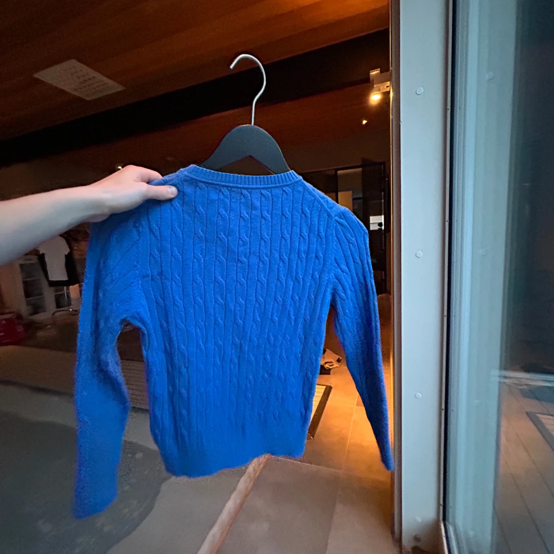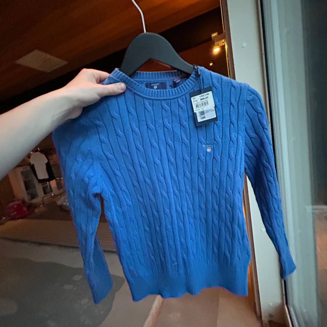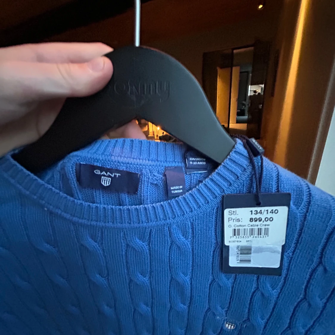 Säljer en blå kabelstickad tröja från GANT med rund halsringning och diskret logga på bröstet. Tröjan har lång ärm och ribbade muddar vid ärmslut och nederkant. Perfekt för en stilren och klassisk look.