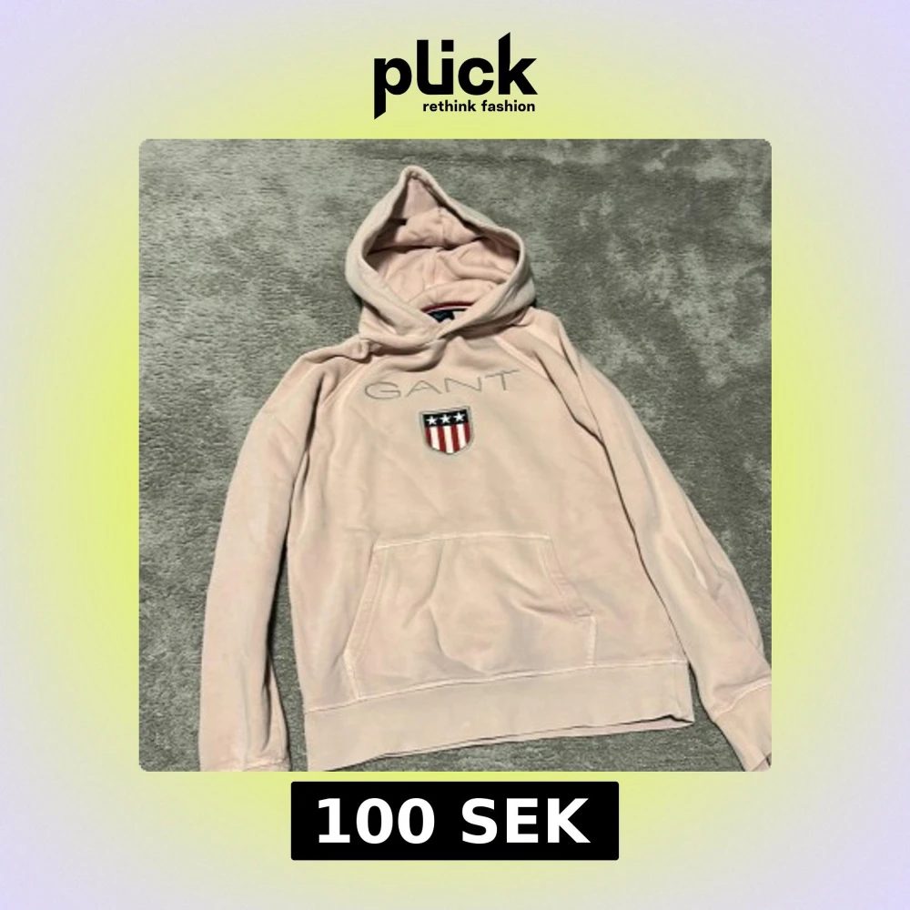 Säljer en ljusrosa hoodie från Gant med broderad logga och sköld på bröstet. Tröjan har huva och en stor magficka framtill. Perfekt för dig som gillar klassisk och sportig stil.