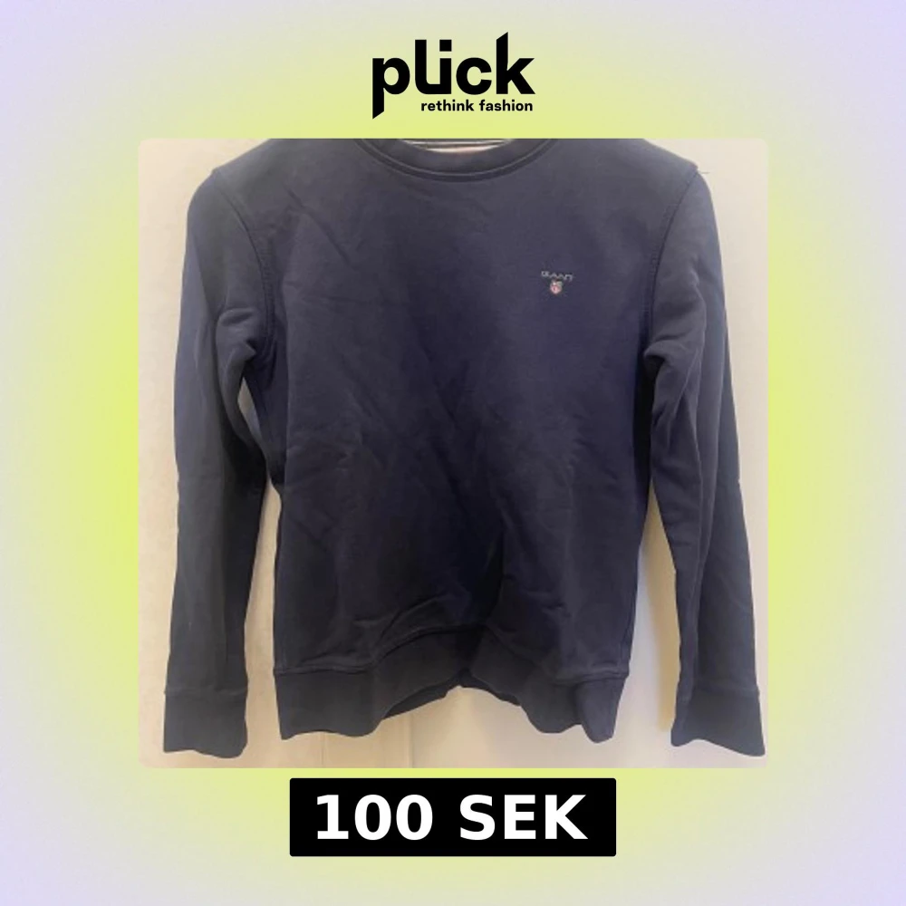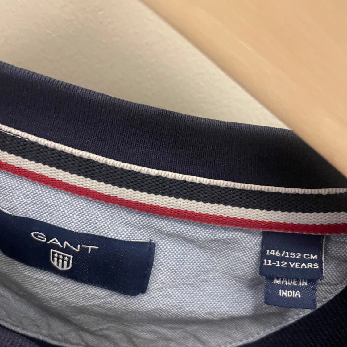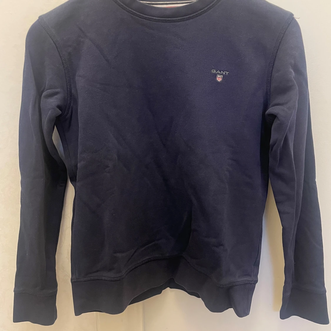 Säljer en stilren mörkblå tröja från Gant med rund halsringning och diskret logga på bröstet. Tröjan har långa ärmar och är perfekt för en avslappnad look. Passar barn i åldern 11-12 år.