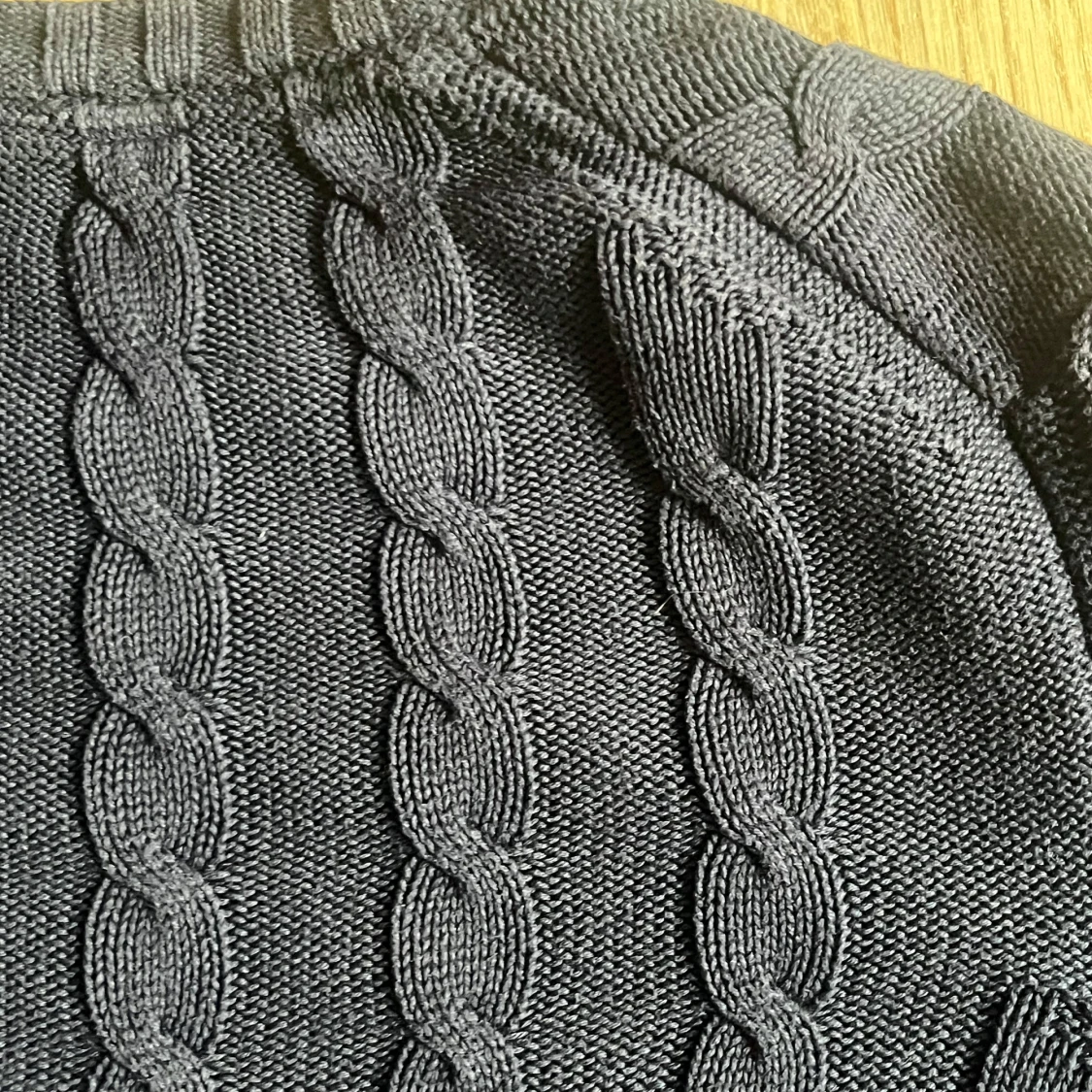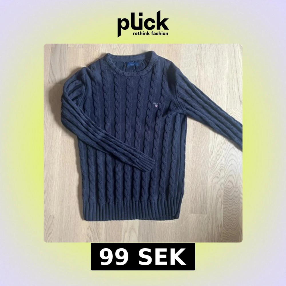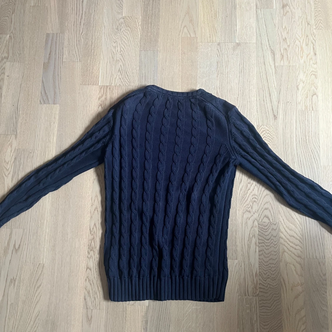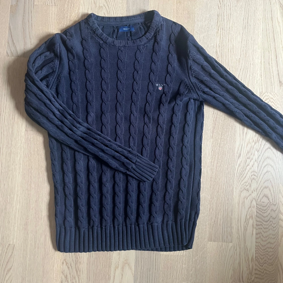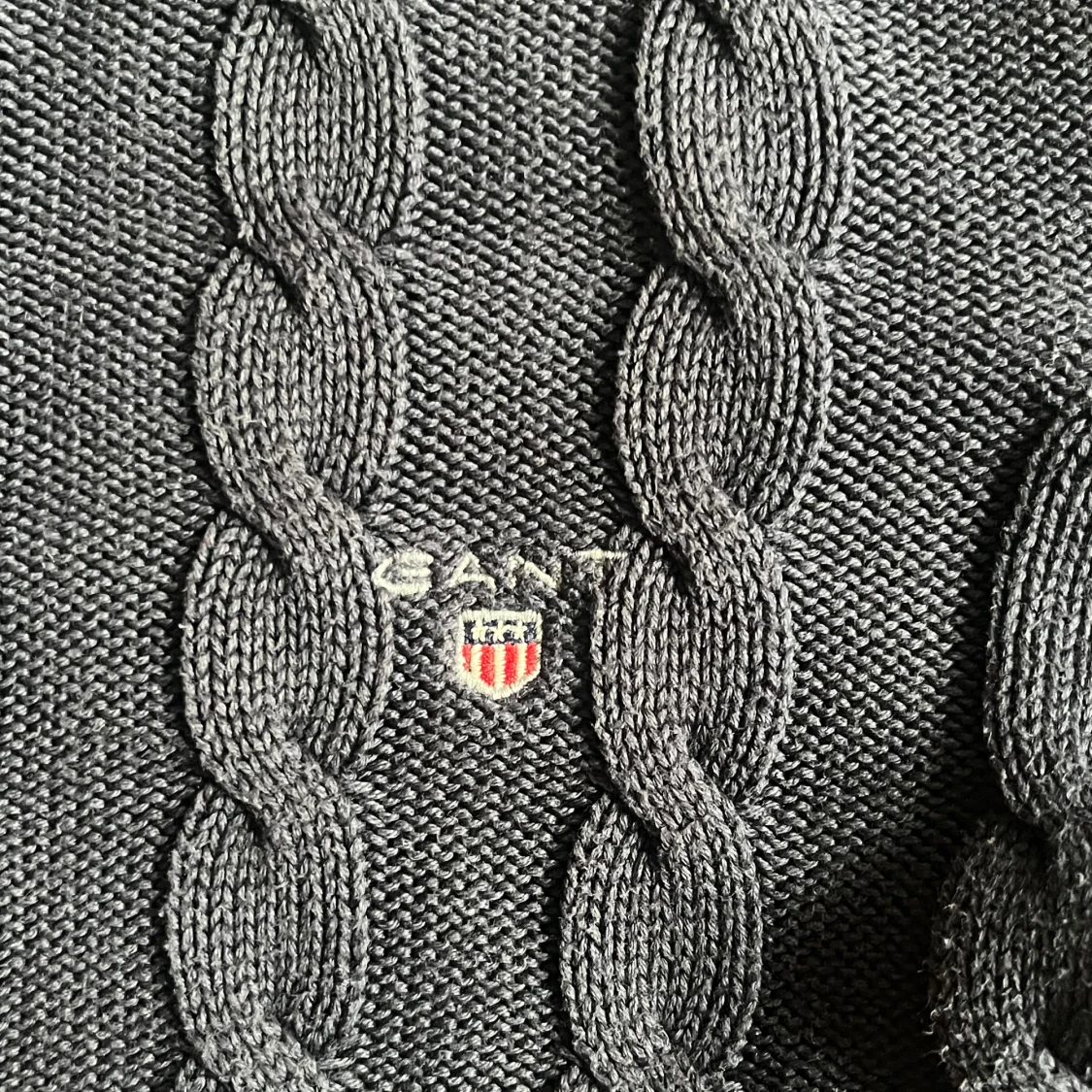 Kabelstickad mörkblå tröja från Gant med broderad logga på bröstet. Tröjan har rund halsringning, långa ärmar och ribbade muddar. Perfekt för dig som gillar klassisk och stilren look. Tröjan har en ganska tight passform och passar nog bra för någon som är runt ~160cm lång. Priset inte hugget i sten!!!