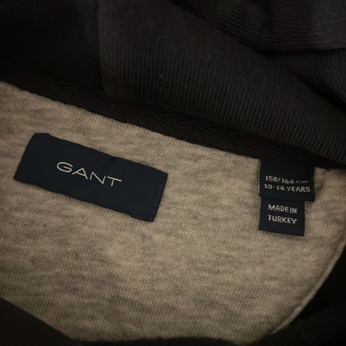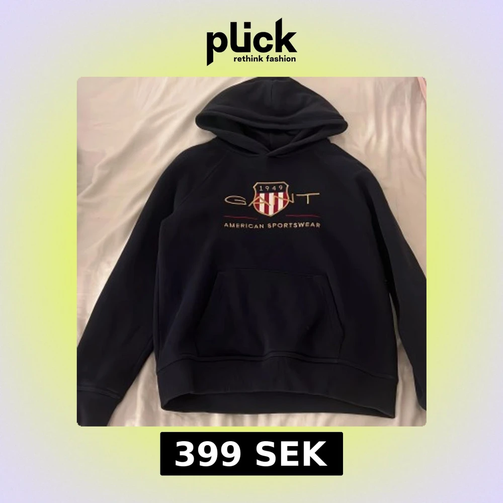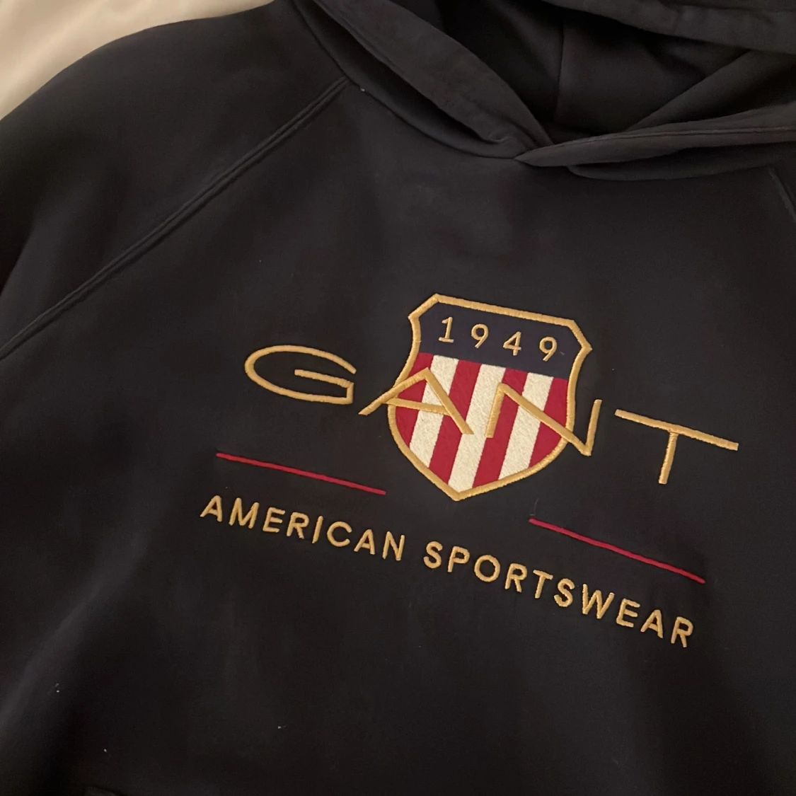 Snygg mörkblå hoodie från GANT med broderat logotyp-tryck och sköld på bröstet. Klassisk känguruficka framtill och huva. Perfekt för dig som gillar sportig och stilren look. Mjuk insida i bomullsblandning. Säljer i storlek 158/164 (13-14år) men skulle säga att den passar xxs/xs också💞