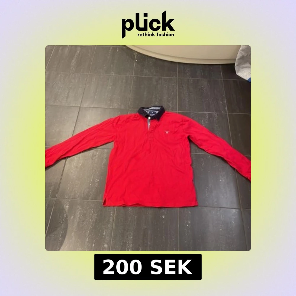 Säljer en klassisk röd långärmad pikétröja från Gant med mörkblå krage och knappslå. Tröjan har en liten broderad logga på bröstet och passar perfekt till en avslappnad men stilren look.