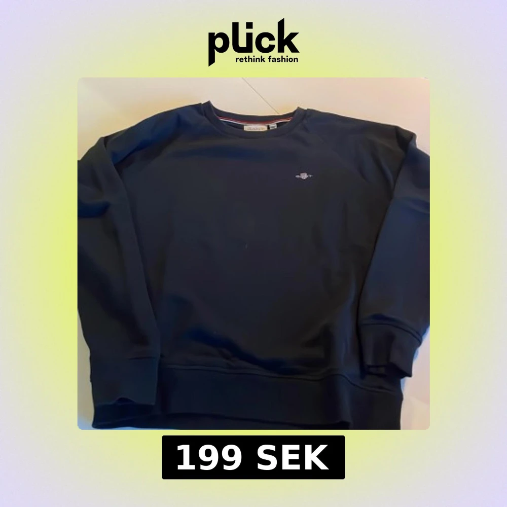 Säljer en stilren mörkblå sweatshirt från GANT med broderad logga på bröstet. Tröjan har rund halsringning med ribbade muddar och en snygg detalj med röd och vit rand på insidan av kragen. Perfekt för en avslappnad look. Storlek 158-164