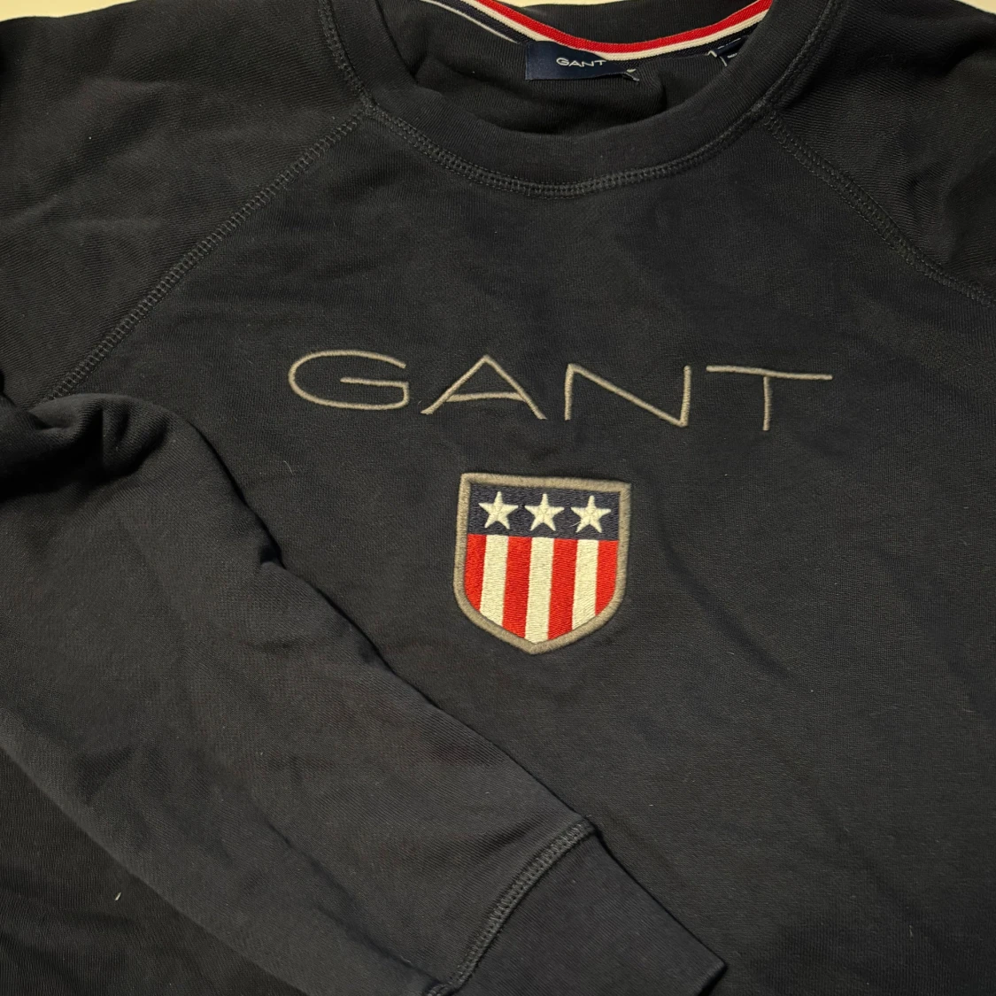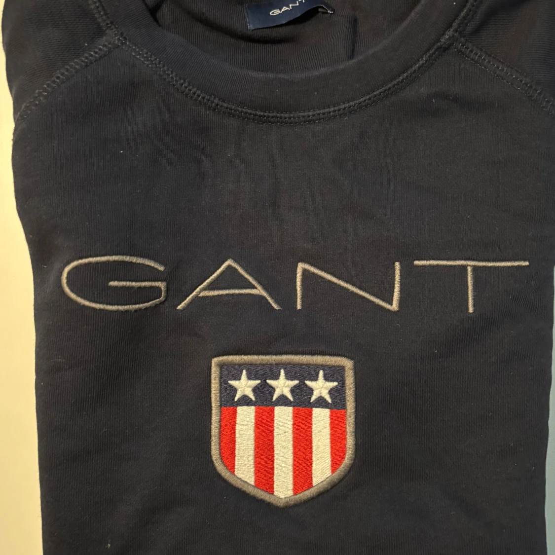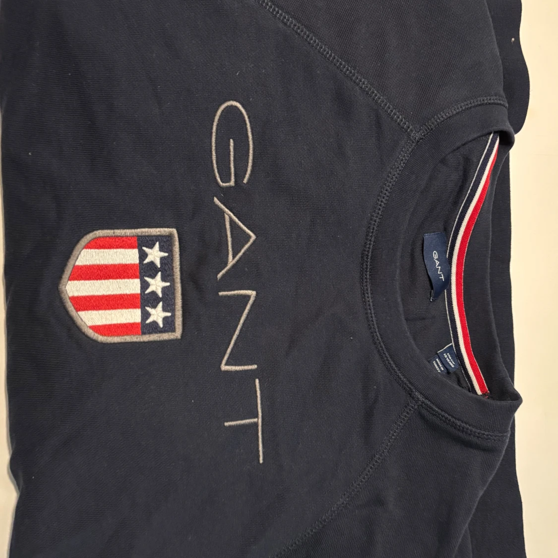 Snygg mörkblå sweatshirt från GANT med broderad logga och ett stort emblem med stjärnor och rödvita ränder på bröstet. Rund hals med röd, vit och blå randig insida. Långärmad och tillverkad i mjuk bomull, perfekt för en chill och stilren look.
