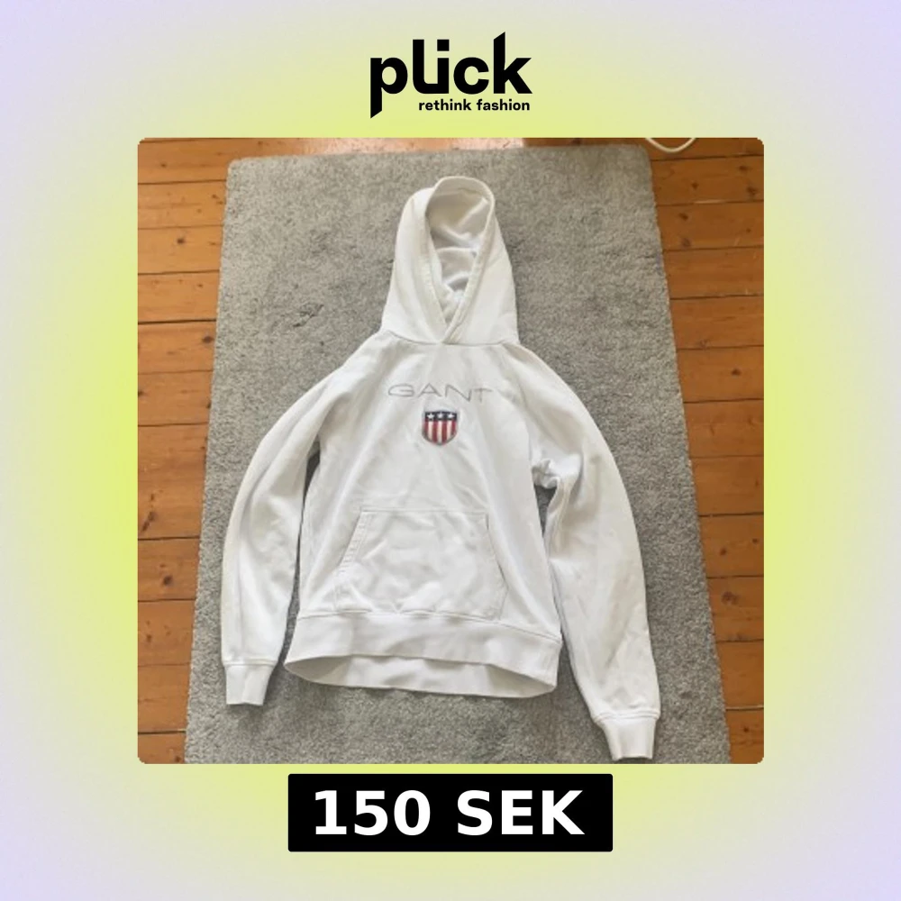 Säljer en vit hoodie från GANT med broderad logga och sköld på bröstet. Tröjan har huva, magficka och ribbade muddar. Perfekt för en avslappnad och stilren look.
