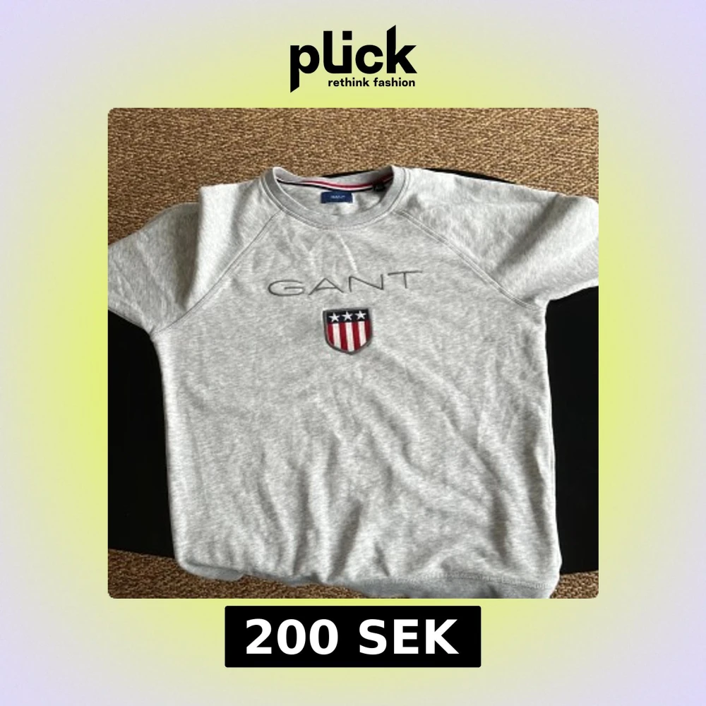 Säljer en stilren grå tröja från GANT med korta ärmar och ett broderat emblem på bröstet. Tröjan har en rund halsringning och är perfekt för en avslappnad stil. Passar både till jeans och shorts. Använd 1 gång bara