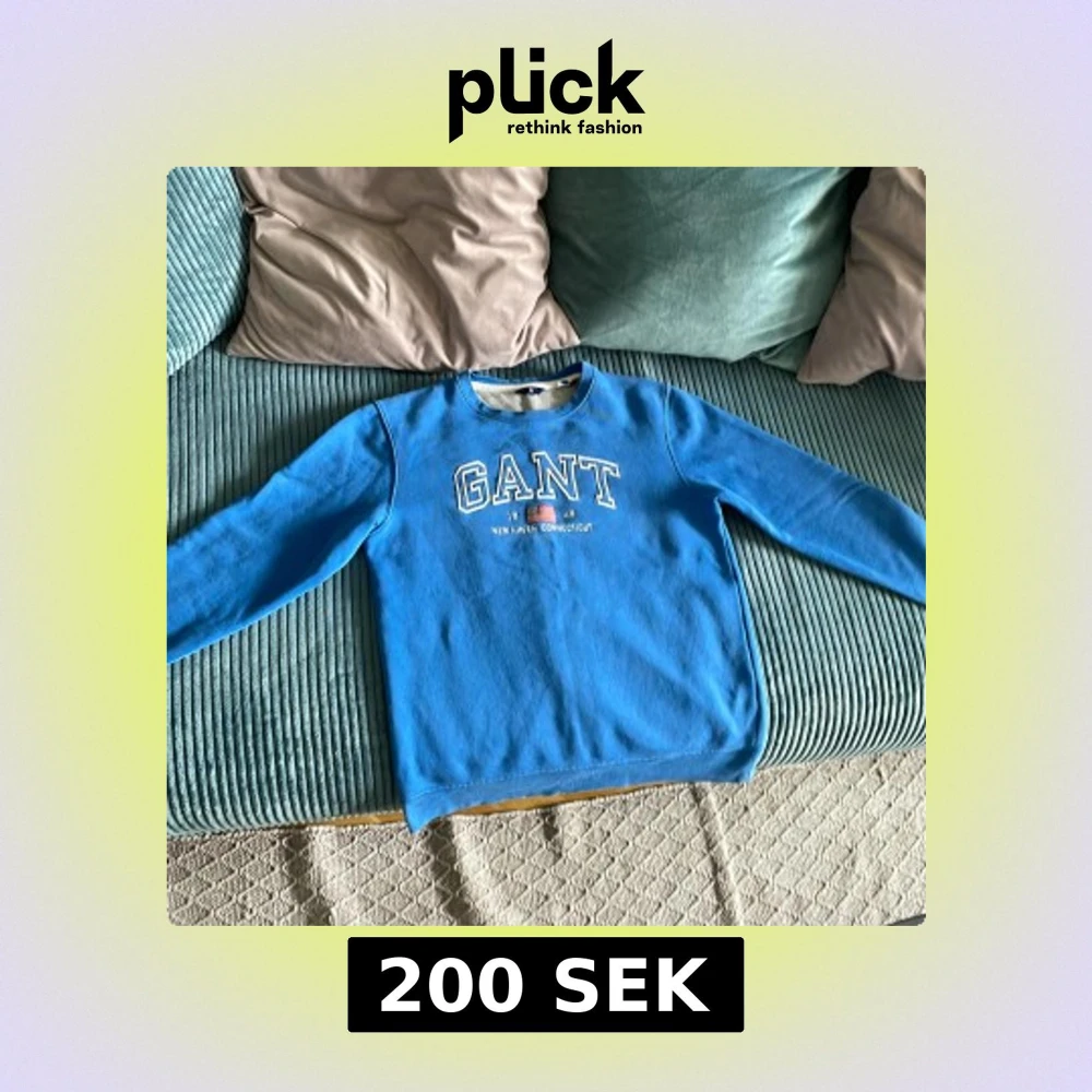 Säljer en blå sweatshirt från GANT med sydd logga och text på bröstet. Tröjan har rund halsringning och långa ärmar. Perfekt för en avslappnad stil och enkel att matcha med jeans eller joggers.