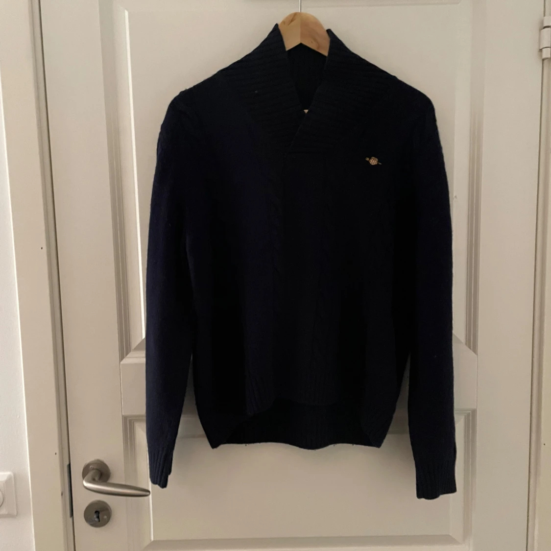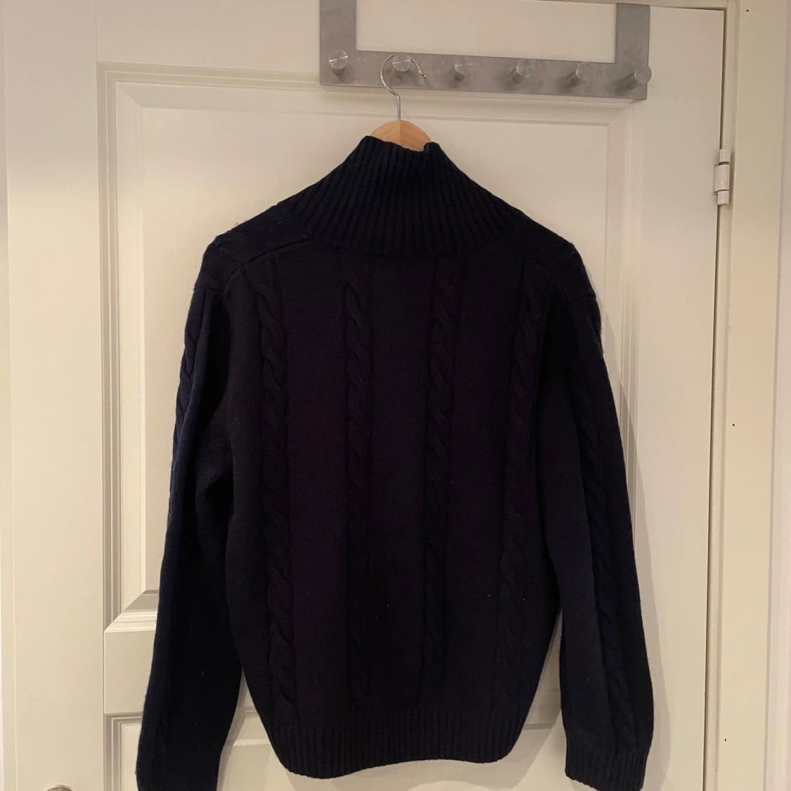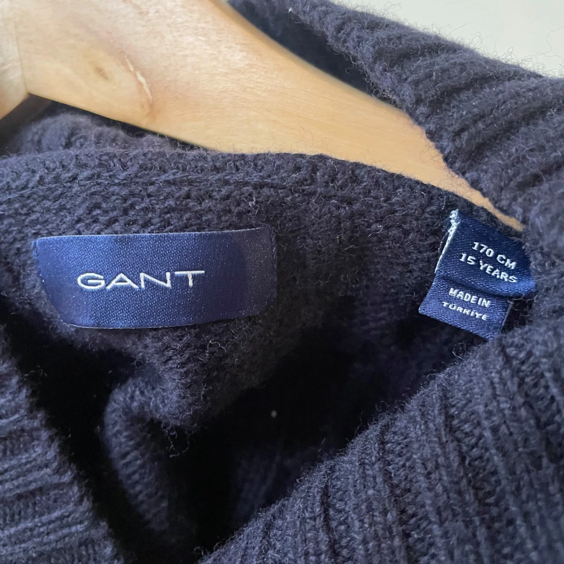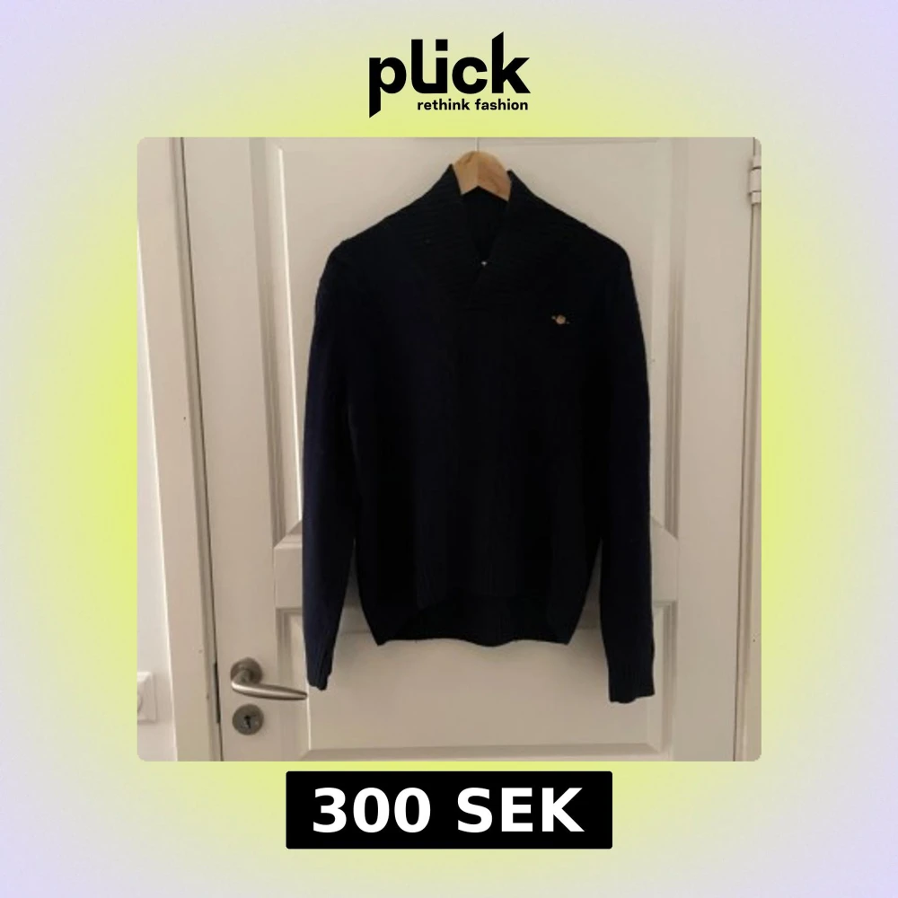 Säljer en stilren mörkblå stickad tröja från GANT. Tröjan har en hög krage och ett diskret märke på bröstet. Perfekt för kyligare dagar med sin ribbade struktur och långa ärmar. Passar både till vardags och mer uppklädda tillfällen.