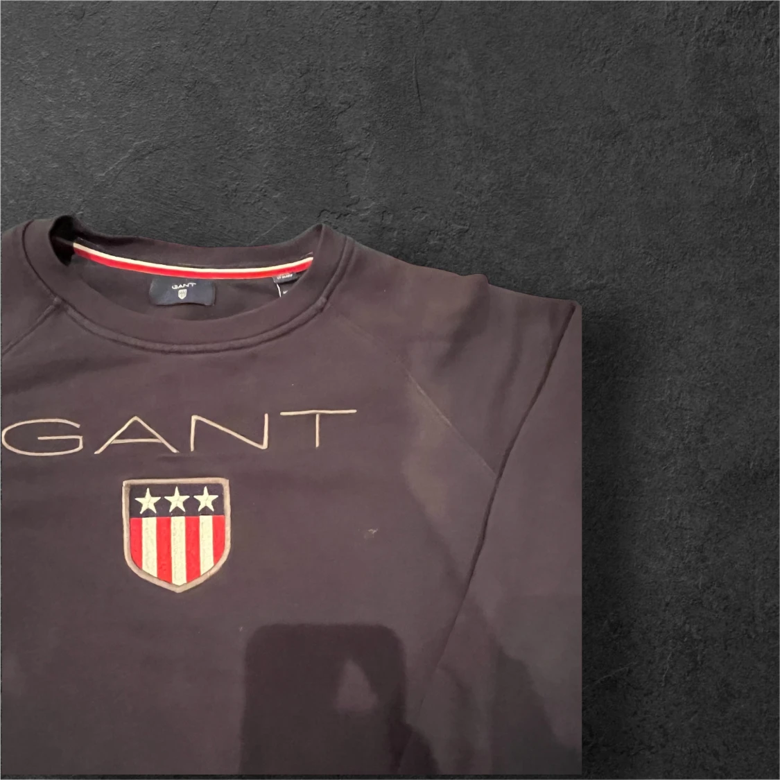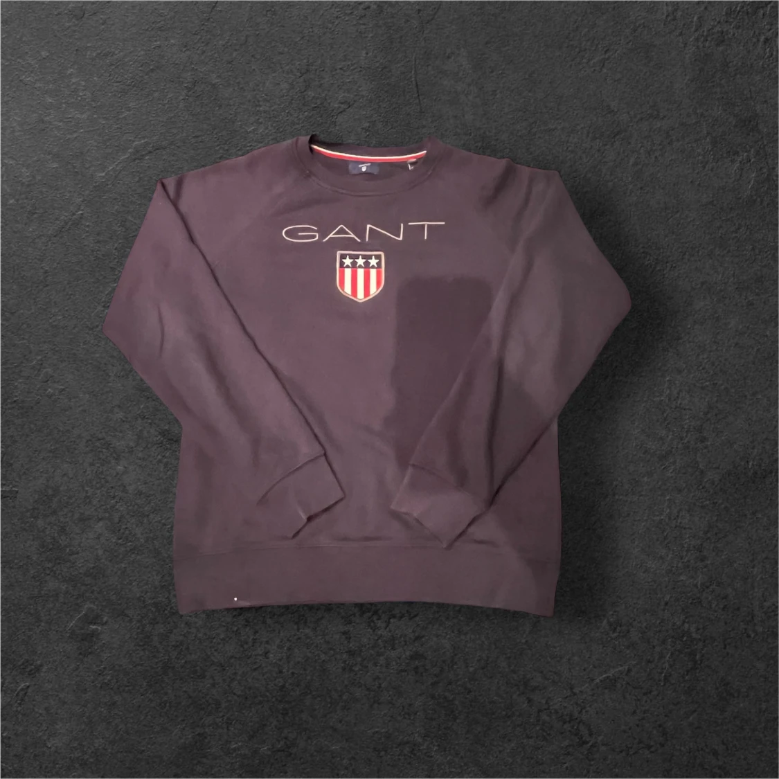 Säljer en mörklila sweatshirt från GANT med broderad logga och sköld på bröstet. Tröjan har rund halsringning, långa ärmar och ribbade muddar. Perfekt för en chill och stilren look.