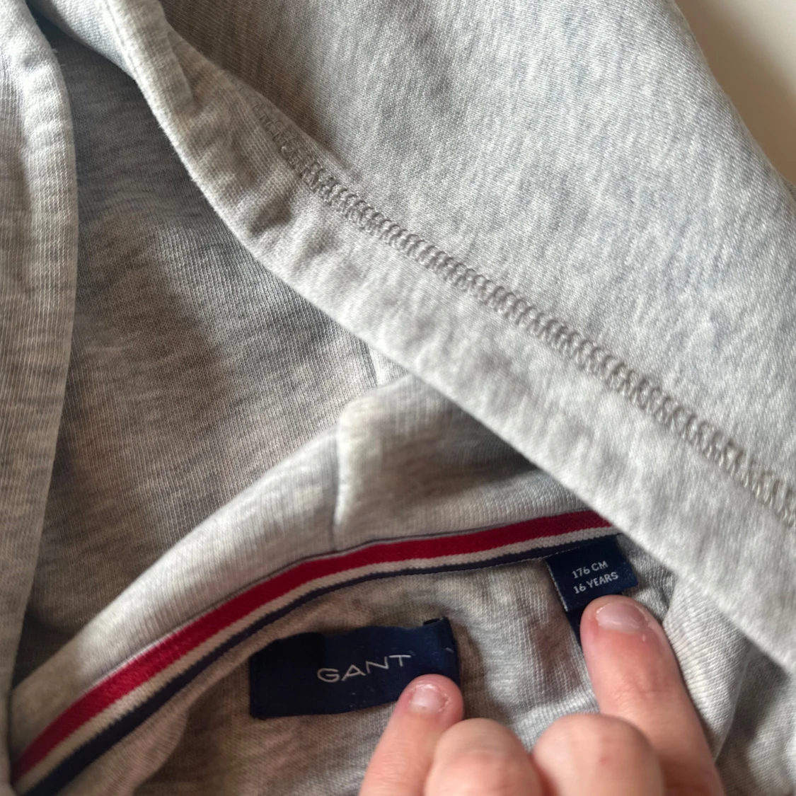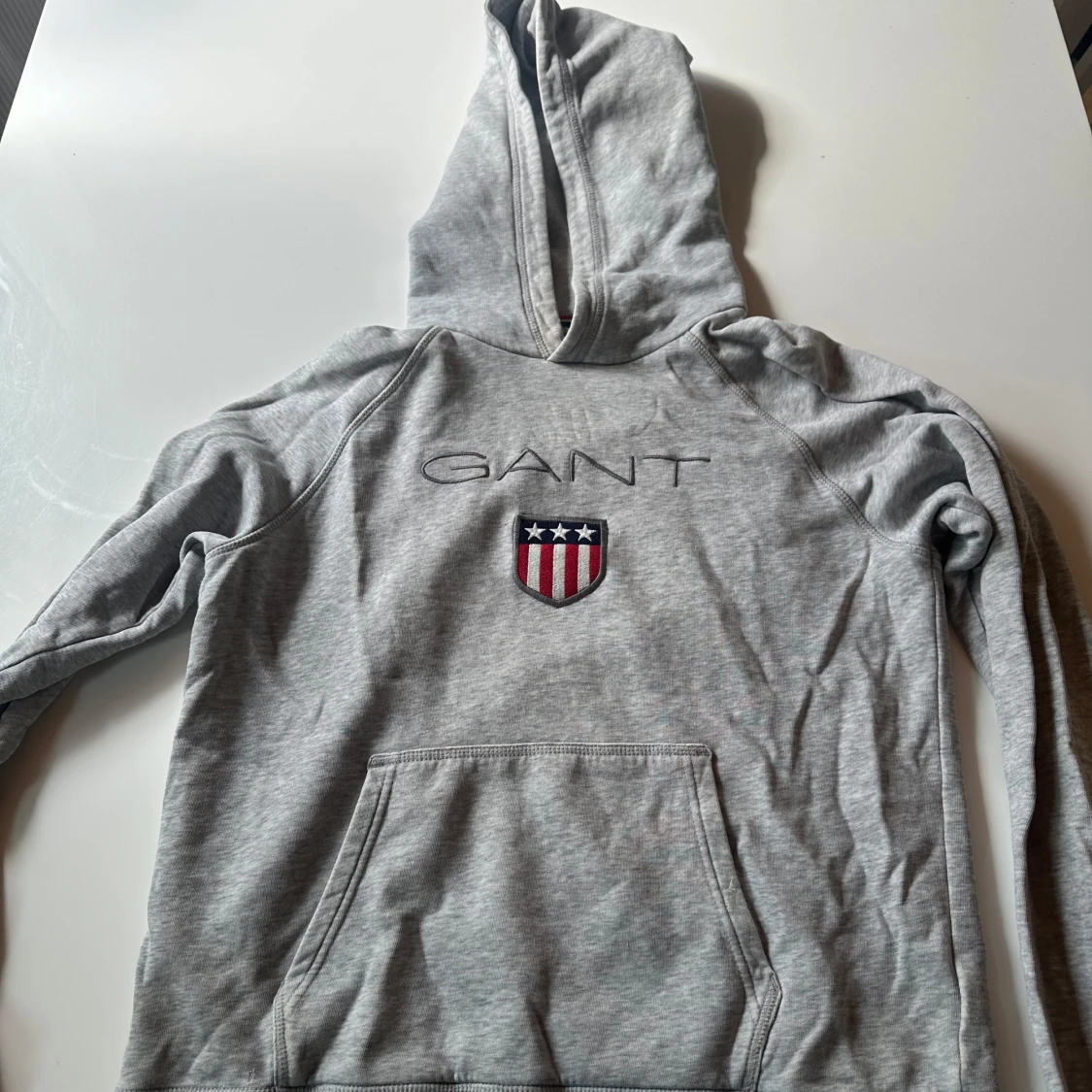 Säljer en grå hoodie från GANT med broderad logga och sköld på bröstet. Tröjan har huva, magficka och långa ärmar. Perfekt för dig som gillar klassisk streetstyle och vill ha något bekvämt och snyggt. Passar dig som är ca 176 cm.