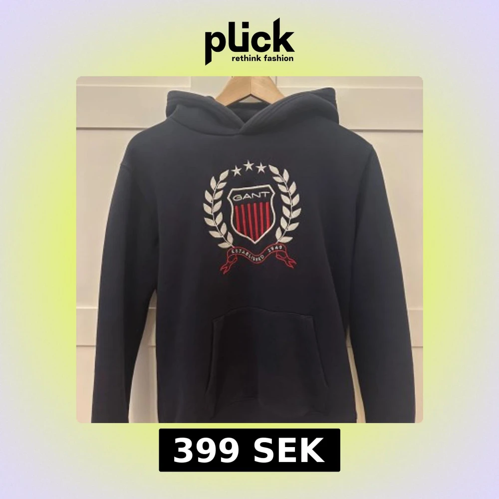 Säljer en mörkblå hoodie från GANT med broderad logga och emblem framtill. Tröjan har huva, känguruficka och ribbade muddar. Perfekt för en avslappnad och sportig stil.