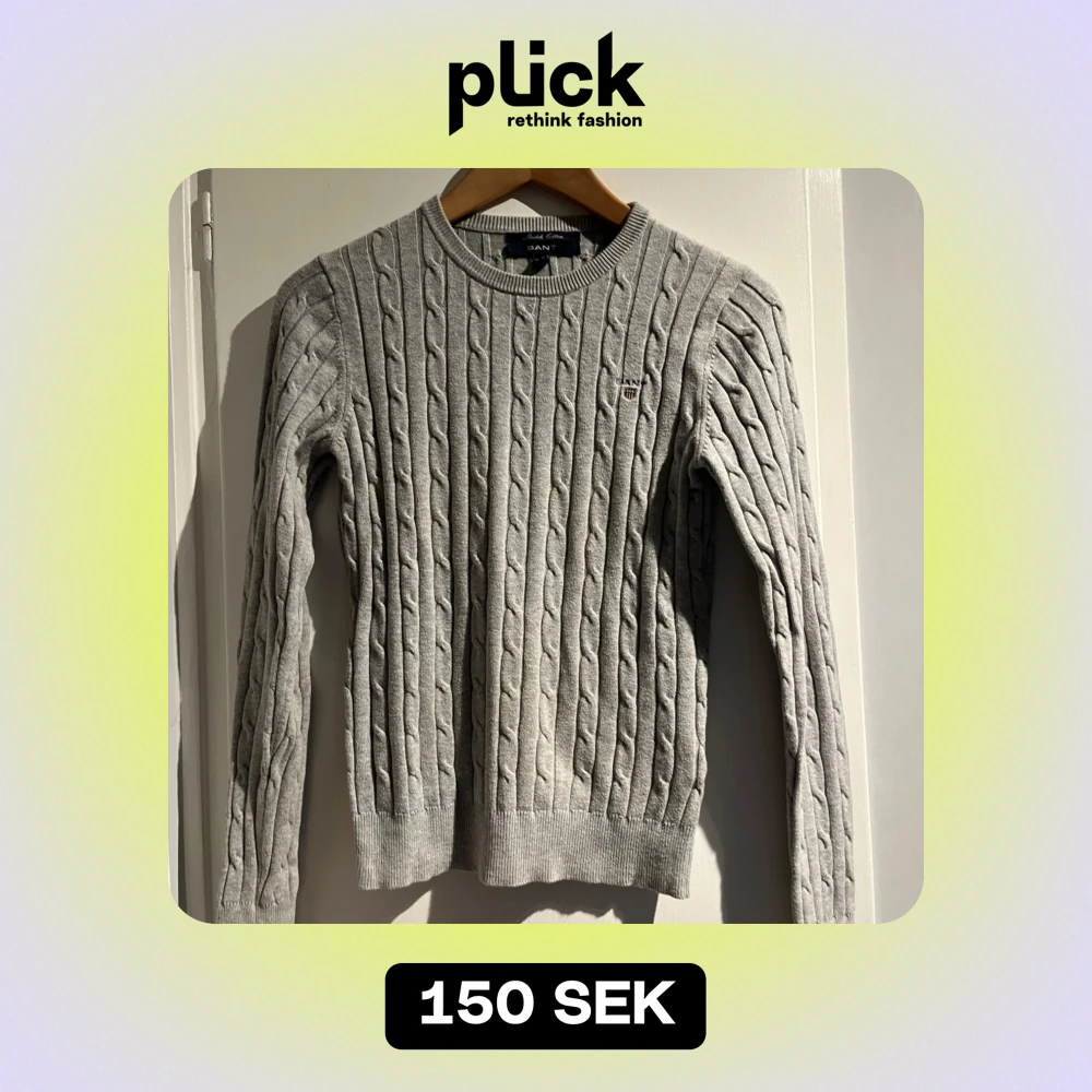 Säljer en snygg grå stickad tröja från GANT. Den har ett klassiskt flätmönster och är perfekt för både höst och vinter. Tröjan är långärmad och har en rund halsringning. Perfekt för att hålla sig varm och stilren! 🧶