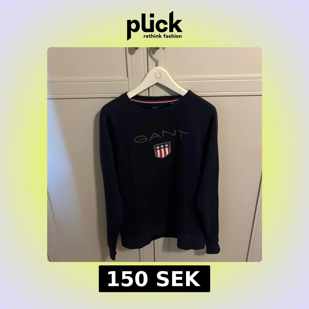 Säljer en mörkblå sweatshirt från GANT med tryckt logga och sköld på bröstet. Tröjan har rund halsringning och långa ärmar. Perfekt för en avslappnad och stilren look.