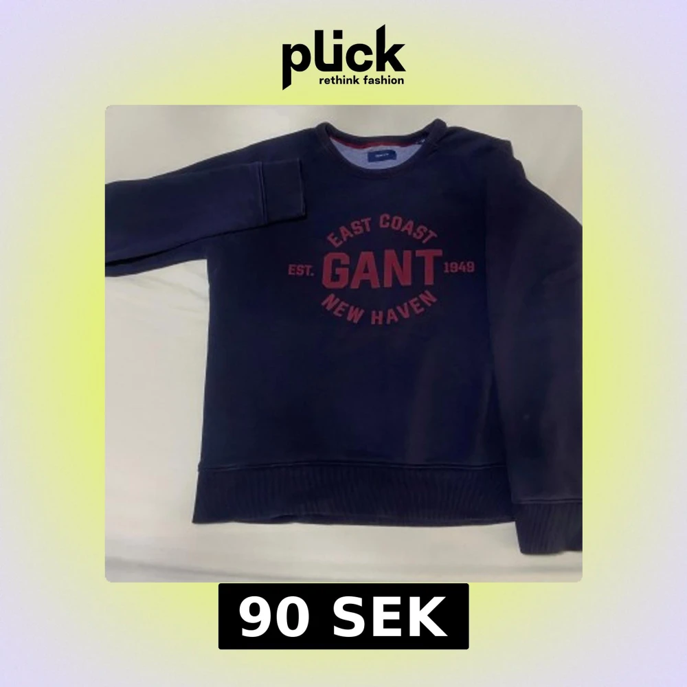 Säljer en mörkblå sweatshirt från Gant med röd text 'East Coast Gant New Haven' på framsidan. Tröjan har långa ärmar och ribbade muddar vid ärmslut och nederkant. Perfekt för en avslappnad stil.
