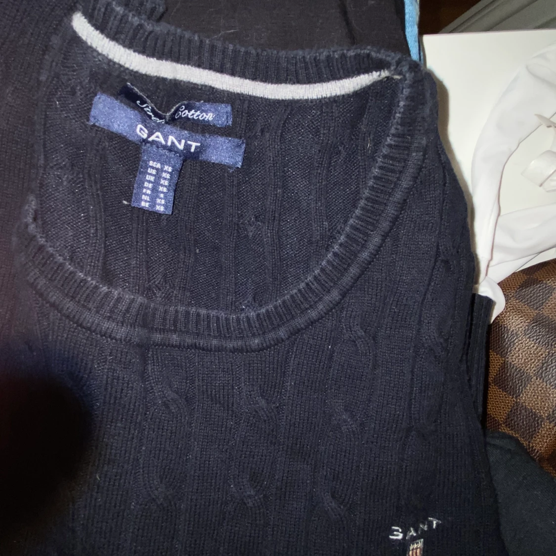 Gant tröja. Använd men i fint skick. Inga fläckar eller skador. Mörkblå/marinblå. Storlek xs. Fraktar helst. Köparen står för fraktkostnad på ca 60kr