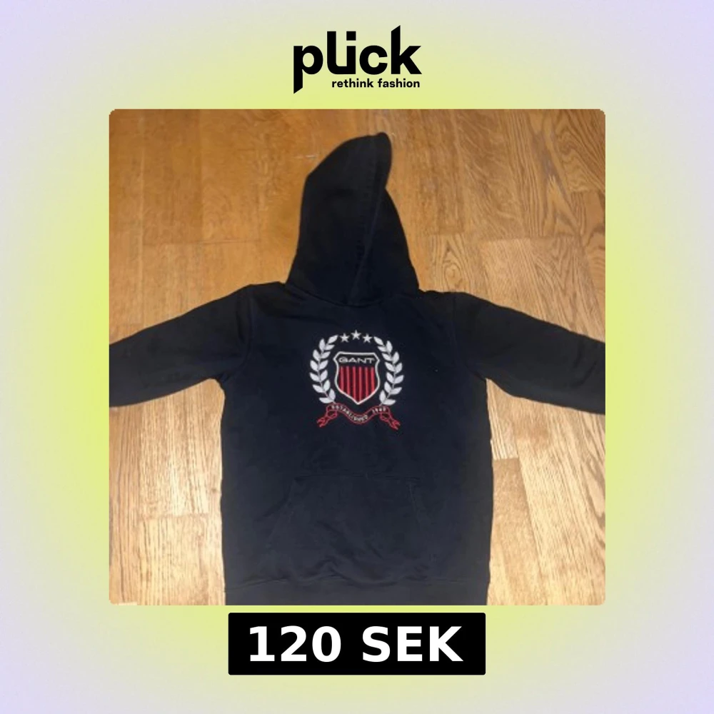 Säljer en svart hoodie från GANT med ett stort emblem på framsidan. Hoodien har en klassisk design med känguruficka och en bekväm huva. Perfekt för en avslappnad stil.