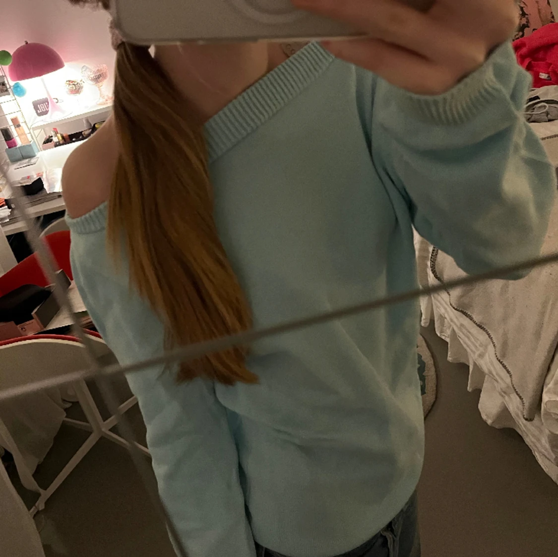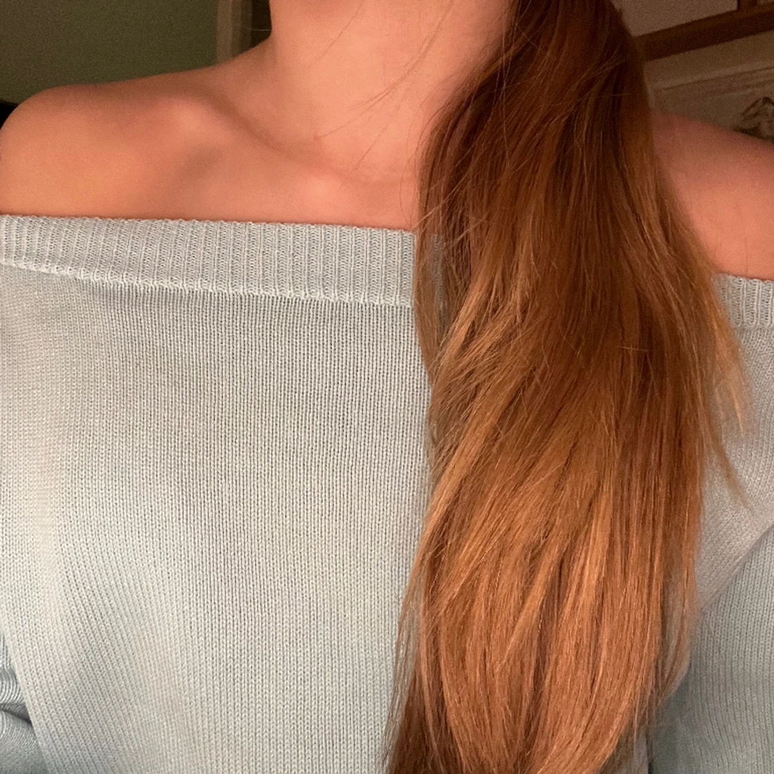 Jäääättefin blå stickad tröja från gant. Jag kan ha den lite off-shoulders. Nypris: ca 1500kr💗💗