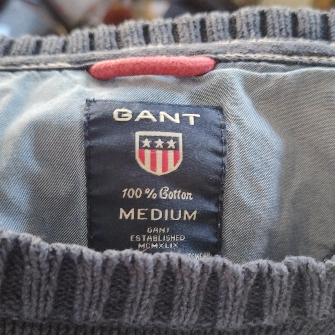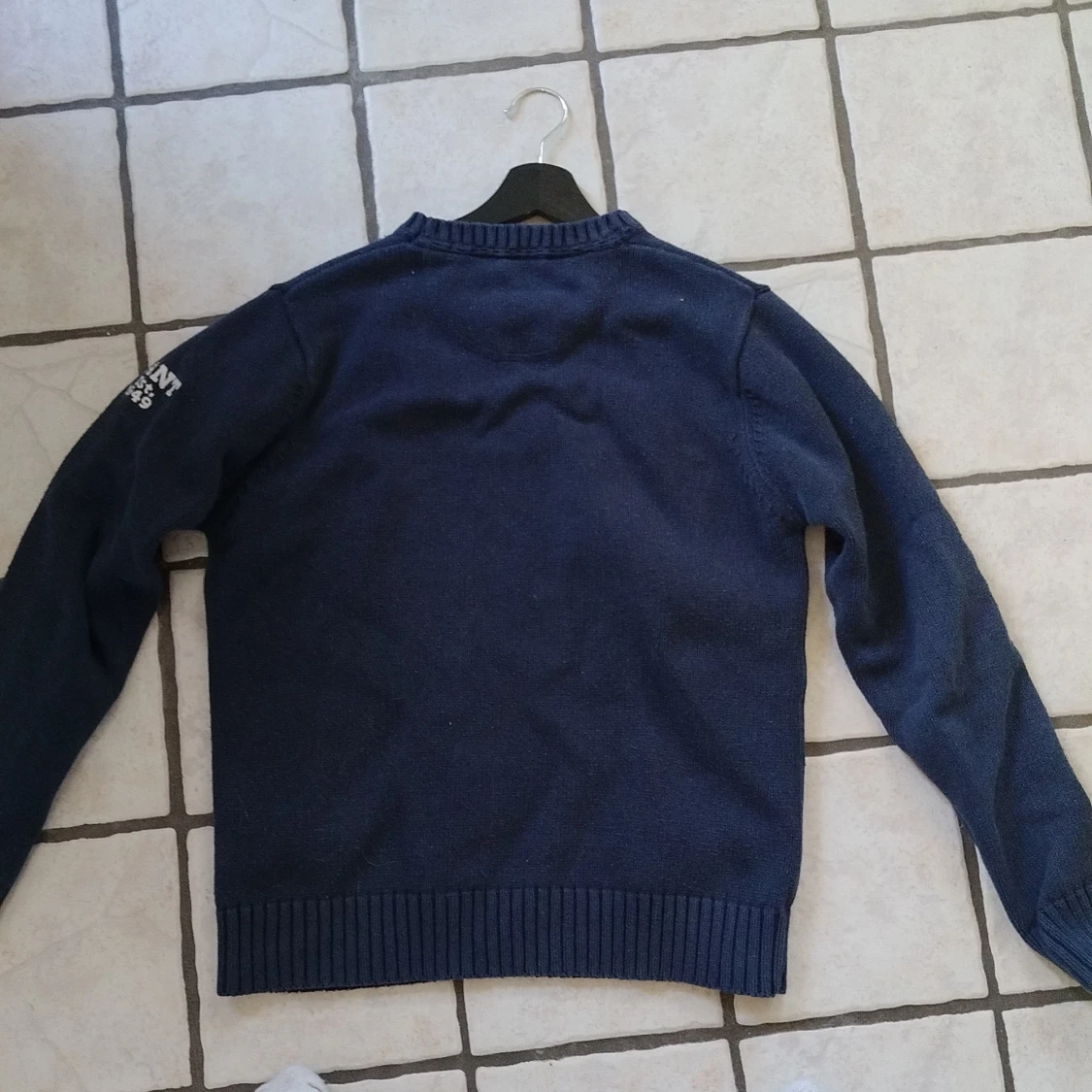 Mörkblå stickad tröja från GANT i 100% bomull. Tröjan har en stor amerikansk flagga broderad på bröstet och ribbade muddar vid ärmslut och nederkant. Klassisk och stilren design med GANT-logga på axeln.