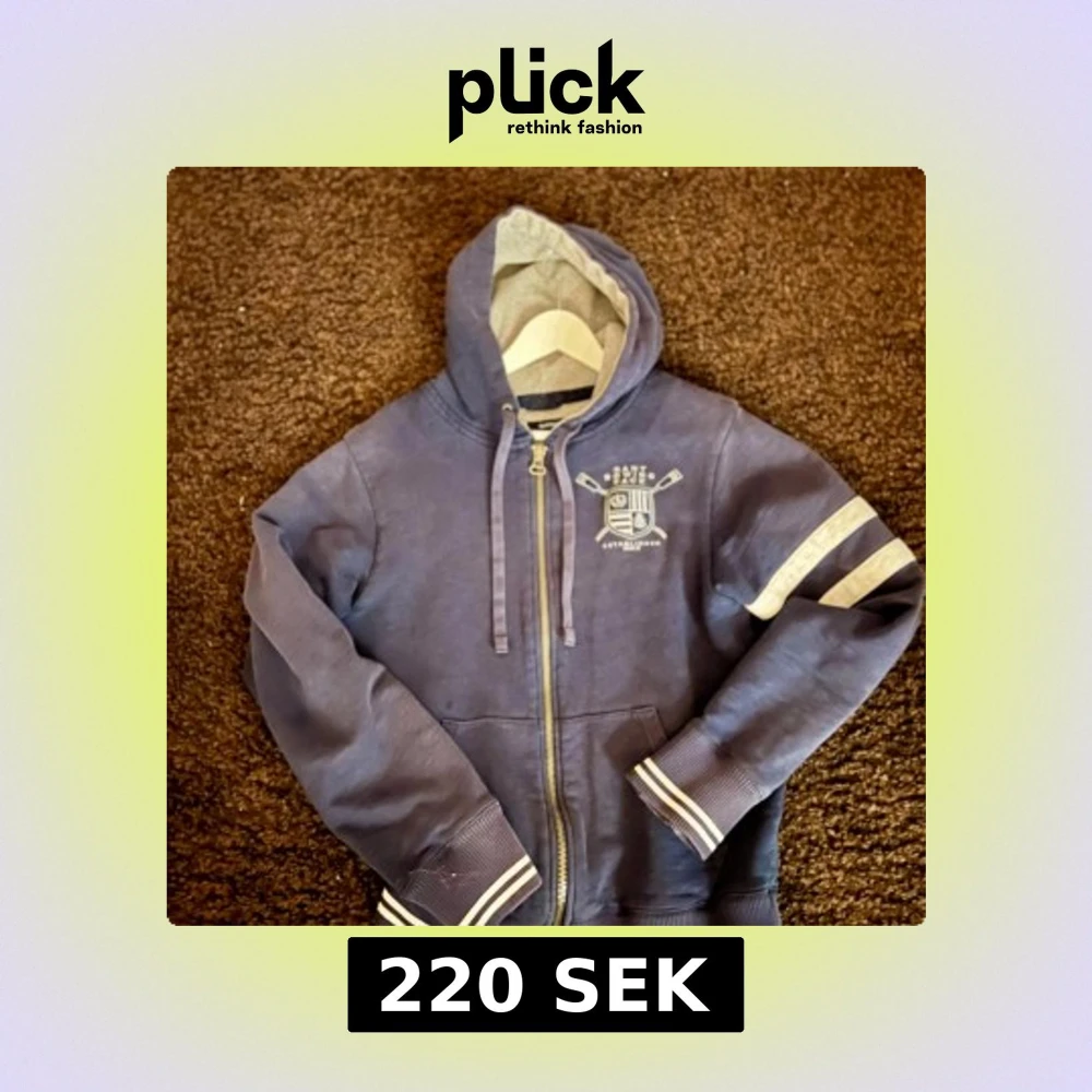 Säljer en blå hoodie med dragkedja och tryck på bröstet. Tröjan har vita ränder på ena ärmen och ribbade muddar vid ärmslut och nederkant. Perfekt för en avslappnad stil.