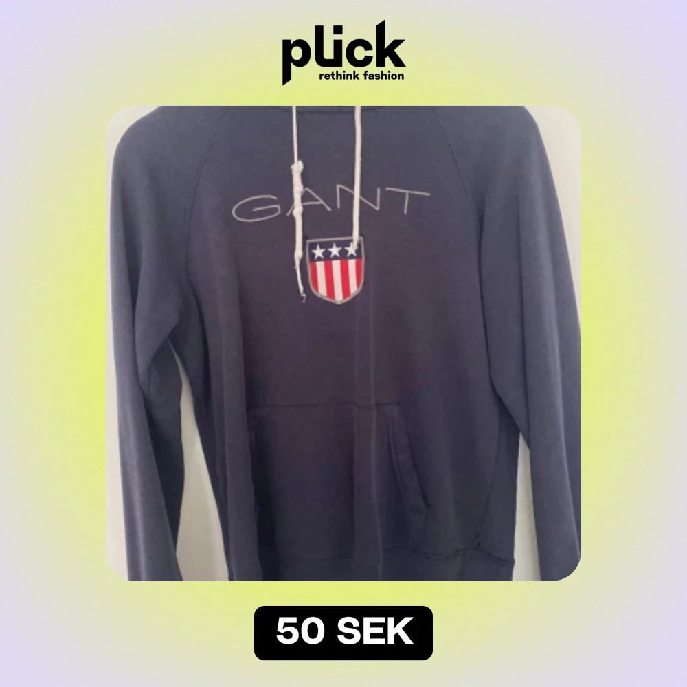 En mörkblå hoodie från GANT med en känguruficka och ett tryck med texten 'GANT' samt en sköld med amerikanska flaggan på framsidan. Hoodien har en justerbar huva med vita dragsnören.