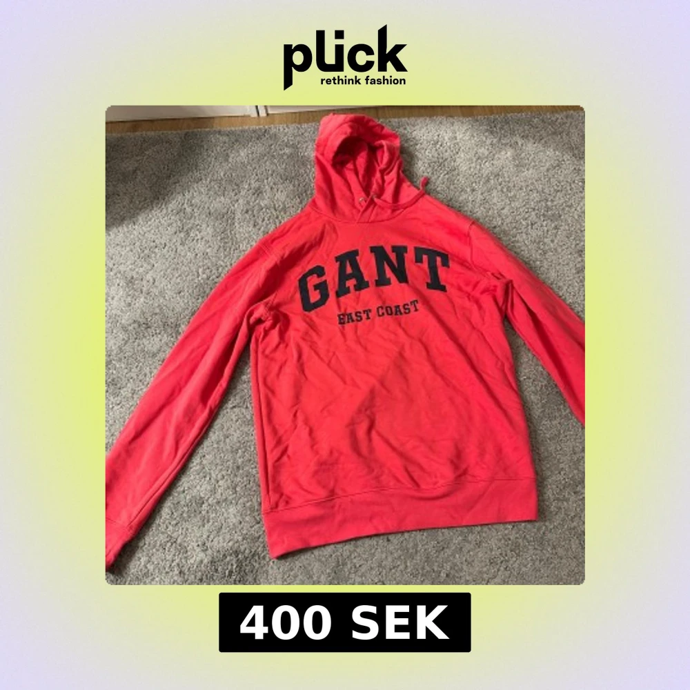 Säljer en snygg röd hoodie från GANT med texten 'EAST COAST' i marinblått på framsidan. Tröjan har en klassisk huva med dragsko och långa ärmar. Perfekt för en avslappnad stil.