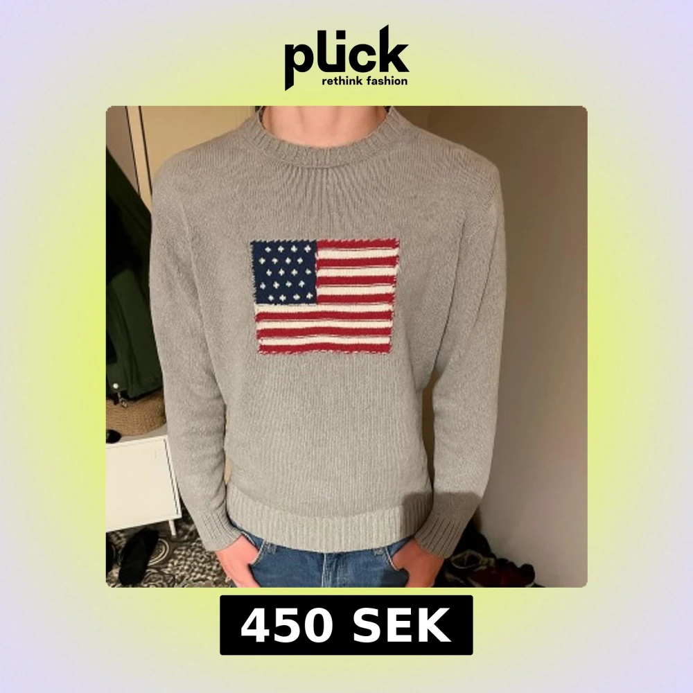 Säljer en grå stickad tröja från GANT i 100% bomull. Tröjan har en stor amerikansk flagga broderad på bröstet och ribbade muddar vid hals, ärmslut och nederkant. Perfekt för dig som gillar klassisk och stilren design med en cool detalj. Storlek L men passar M som du ser. Tröjan är knappt använd. Inga defekter eller sådant.